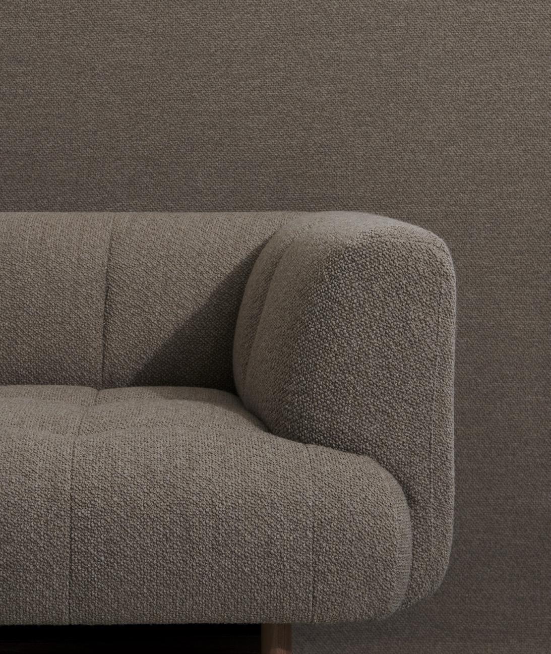 SEAT & BACK | Full upholstered wadded PU foam. INNER FRAME | FSC™-certified wood construction w. a spring system and non-woven fabric bottom. LEGS | Solid wood w. felt pads.