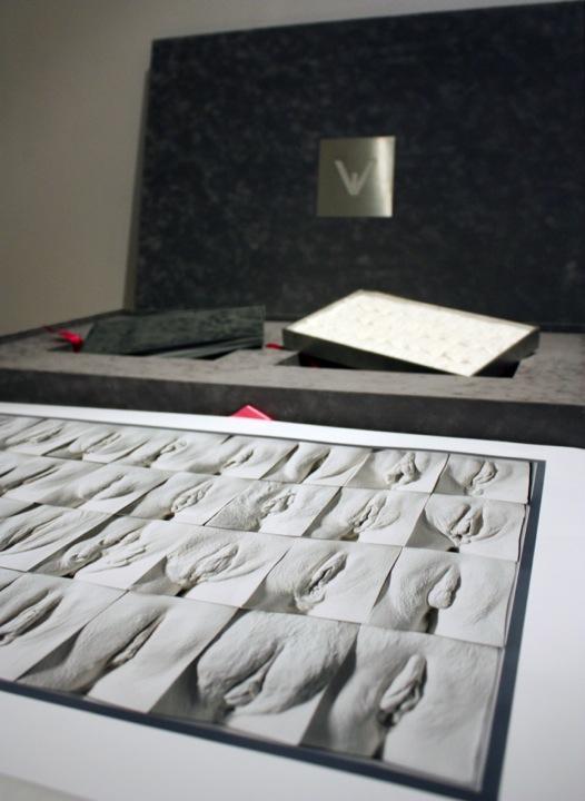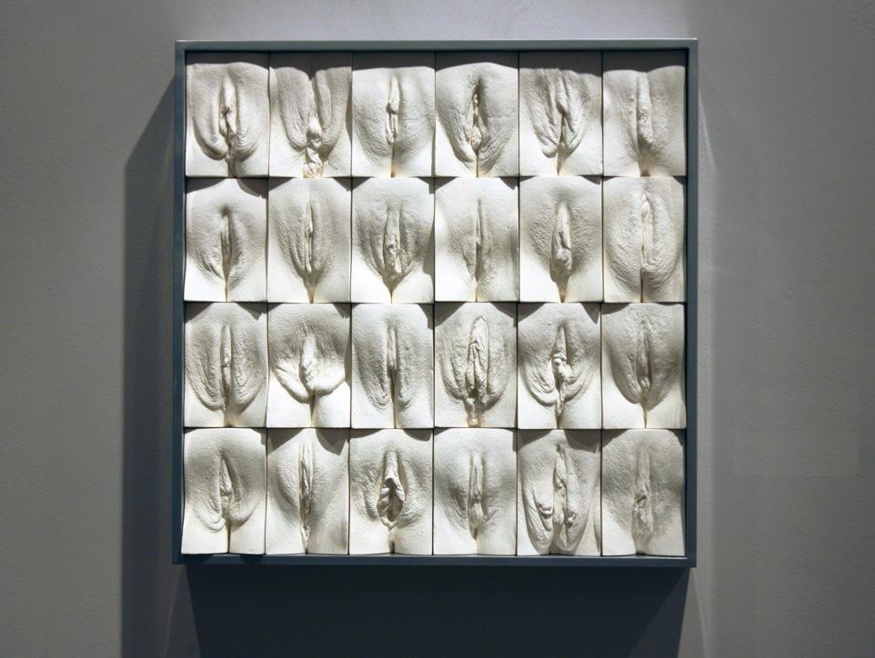 The Vagina panels are constructed from plaster casts taken from women volunteers’ vulvas. These original casts have been remoulded and cast again to produce these limited edition panels. Their presentation is the same style of silver, powder coated, aluminium frames as The Great Wall of Vagina but none of these other panels will have its 4x10 format.