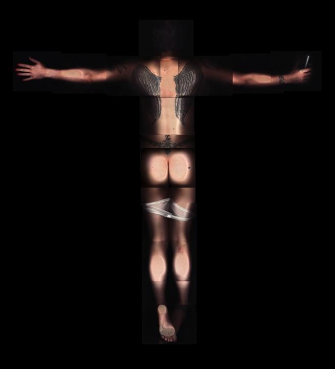 This is a complimentary piece to Fallen Angel. They would look amazing side by side or on opposite walls. Stephen’s toned but lean body and Mediterranean colouring made him ideal for such a piece. What inspired me though was a small crucifix he wears as a ring. It was perfect. It’s a cruciform pose and is clearly referencing Christ but he appears to be walking towards you, arms outstretched to hug you. I exaggerated the wounds and allowed them to smear against the glass of the scanner so they look wet. I wanted them to really stand out from the otherwise muted tones. Barbed wire replaces a crown of thorns for a more contemporary depiction. Enigmatically it crosses between crucifixion and resurrection in one image. I think that gives the piece its power. The keen-eyed will spot a very good reason why this isn’t in fact Jesus.