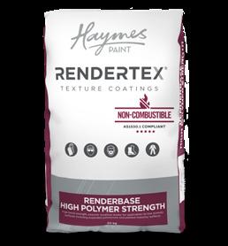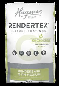 Haymes Rendertex textural coatings now includes a range of Renderbase dry bag renders to suit multiple substrates. All the Haymes Renderbase and Renderbase "Q" bag ranges comply with the Australian standard AS1530 for Non-Combustibility. The Renderbase range and material is NOT deemed combustible according to CSIRO