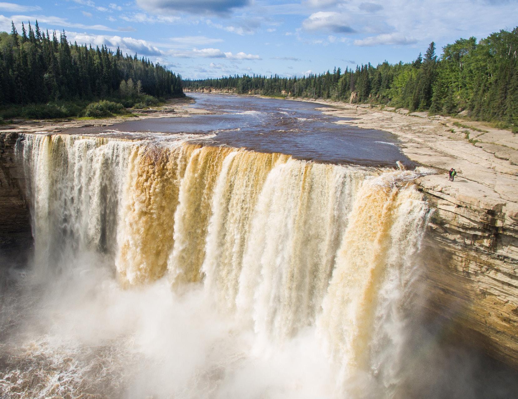 While only half the height of Alexandra Falls, the 114-foot Louise Falls are no less dramatic, as water cascades spectacularly into