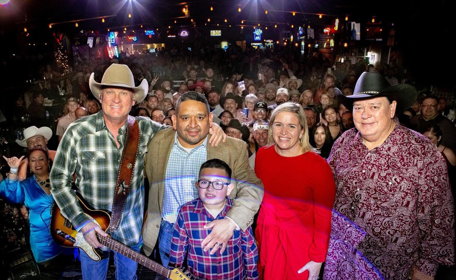 Top left, Kevin Fowler (left) and David Lee Garza (right) take a moment to join the Pastrano family in a photo with the crowd. Pictured is Chevo (second from left), his wife Ginna (second from right) and their son Gino (front). Bottom left, gifts were gathered following the event and loaded into a trailer (above photo).