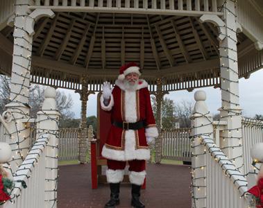 volunteer Soleil Johnson, left, outside Inspired Minds Art Center during Cocoa Jingle. Top right, a letter writing station was available to mail letters to Santa. Bottom left, commemorative mugs were available to purchase and nearly 20 local businesses along Main Street participated by providing complimentary hot chocolate. Bottom right, Santa has been busy around Hays County; he was spotted at Cocoa Jingle taking free pictures with families at the downtown greenbelt gazebo.