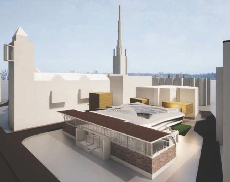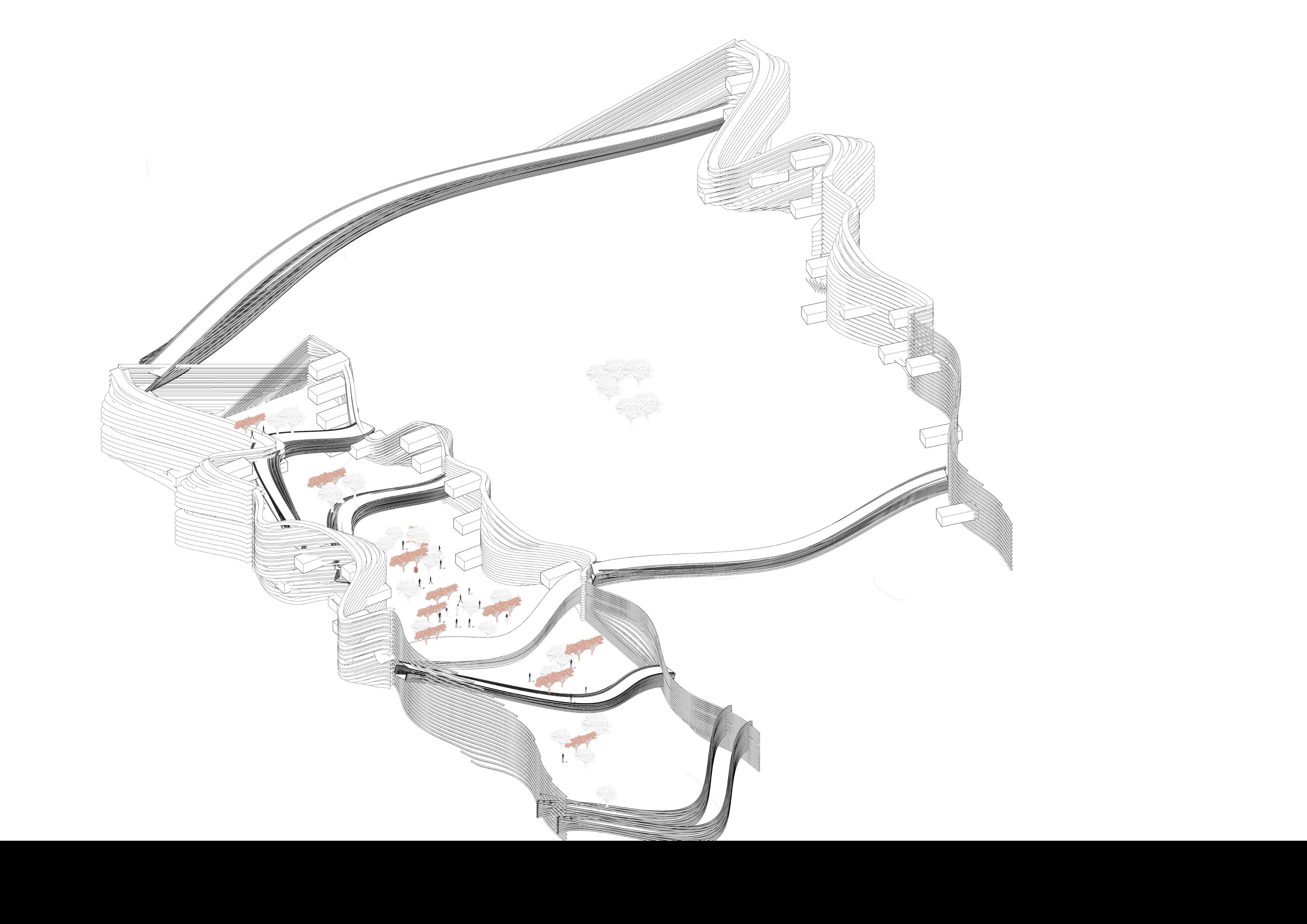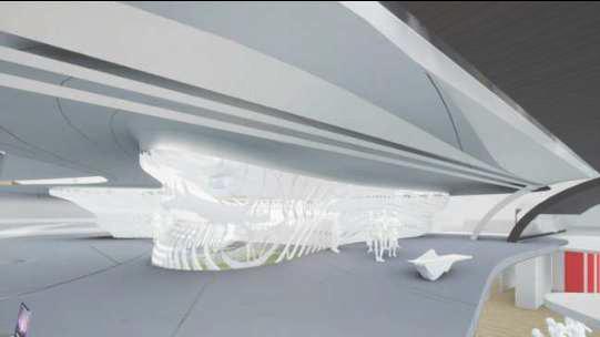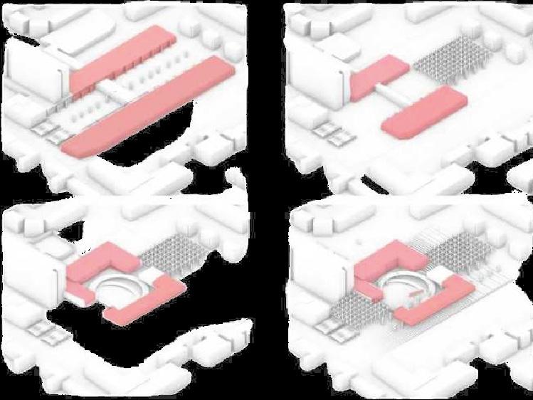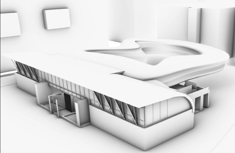 it started out as a snake-like structure stretching from metropolis and evolved into the loop structure explored further throughout the project, where the central part of metropolis roof merges with the new structure in a continuous wave-like form