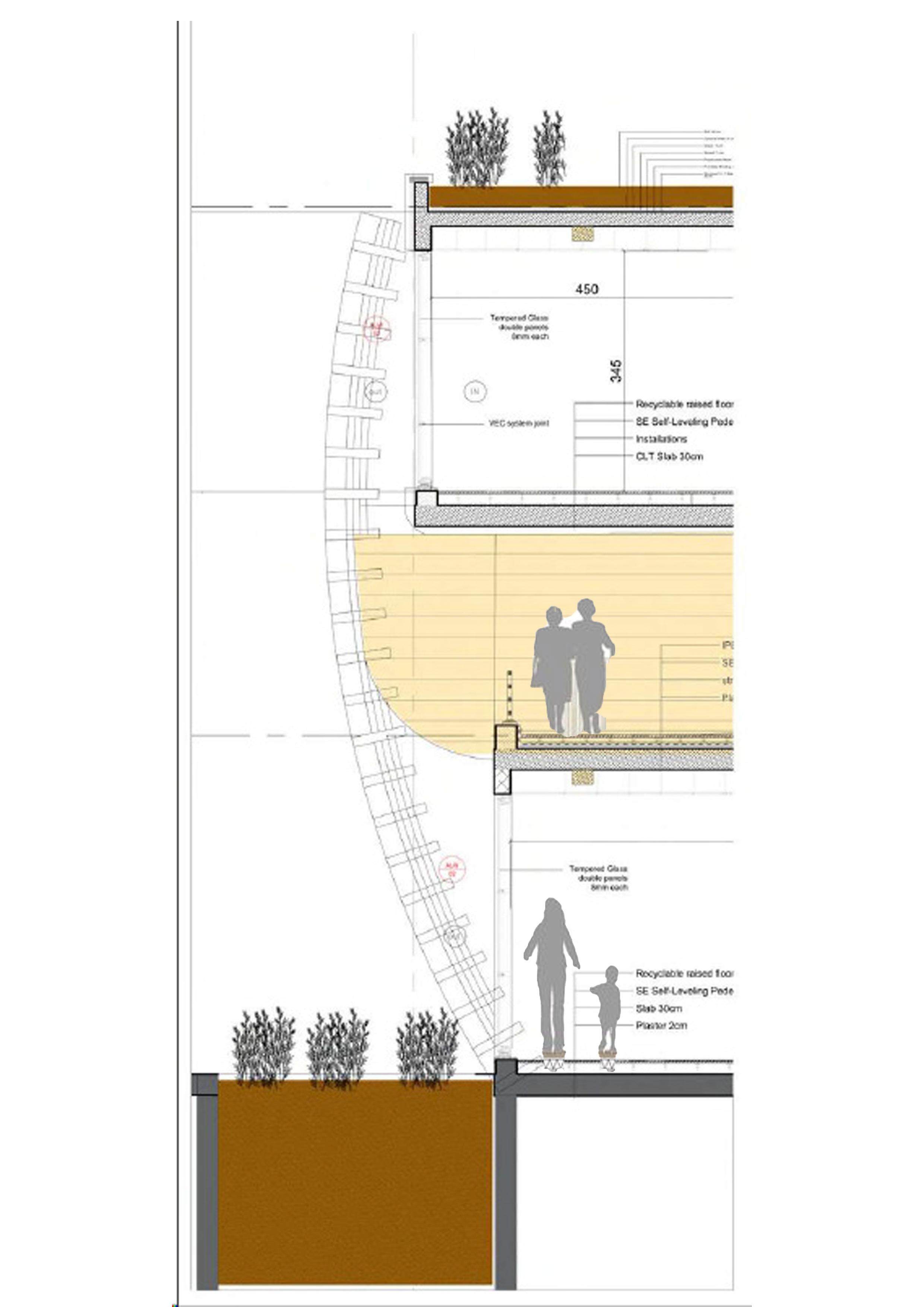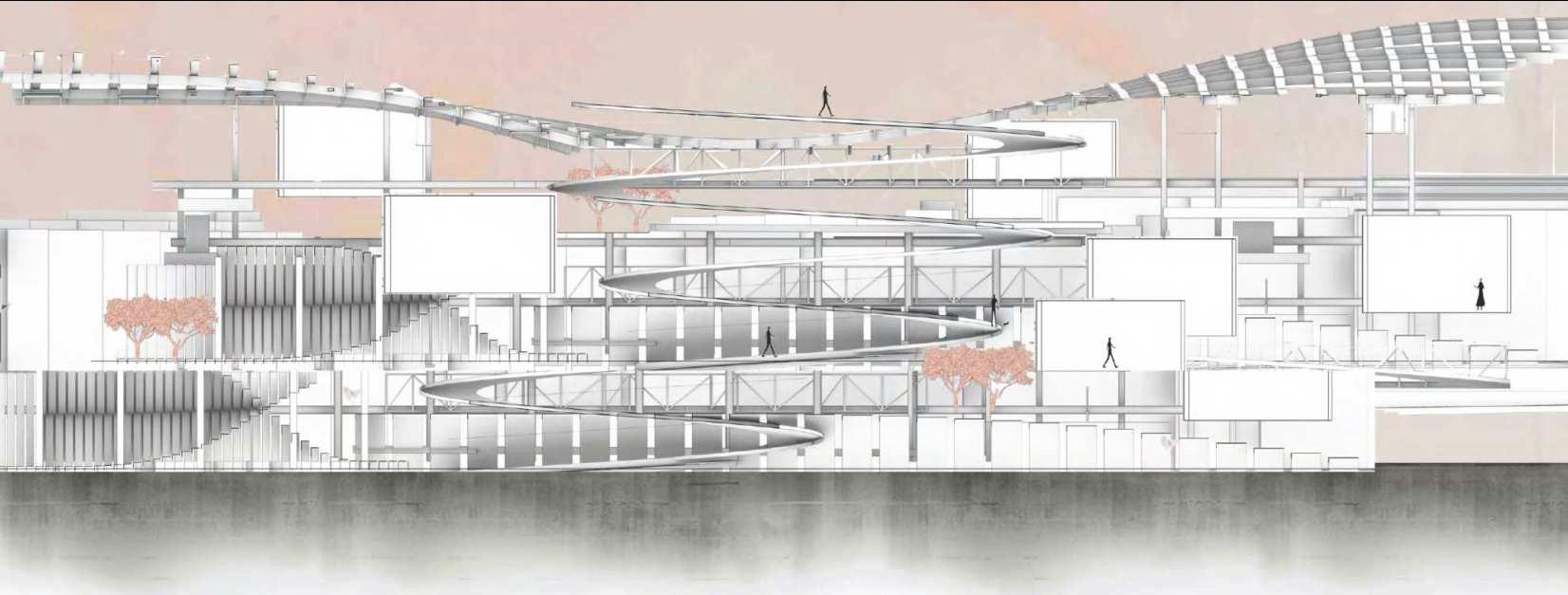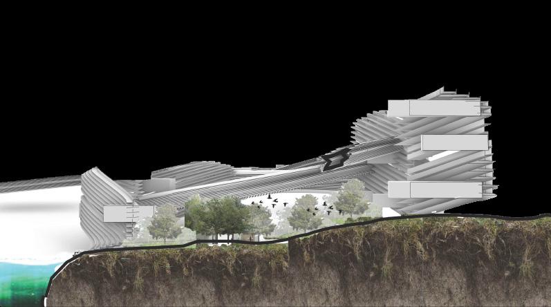 As the central circulation spine of the project, the spiraling atrium facilitates dynamic movement and ûow, encouraging visitors to ascend and descend through its levels in a continuous loop. Its spiraling form creates opportunities for unexpected encounters and interactions, enriching the overall visitor experience.