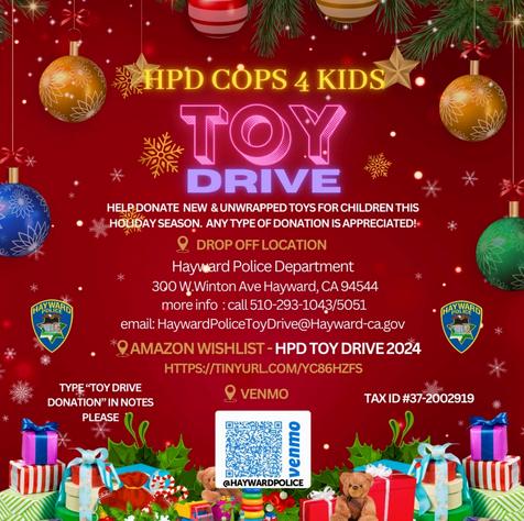 Please consider bringing a new, unwrapped toy for the Alameda County Sheriff's Office or canned/non perishable food item for Davis Street Community Center.