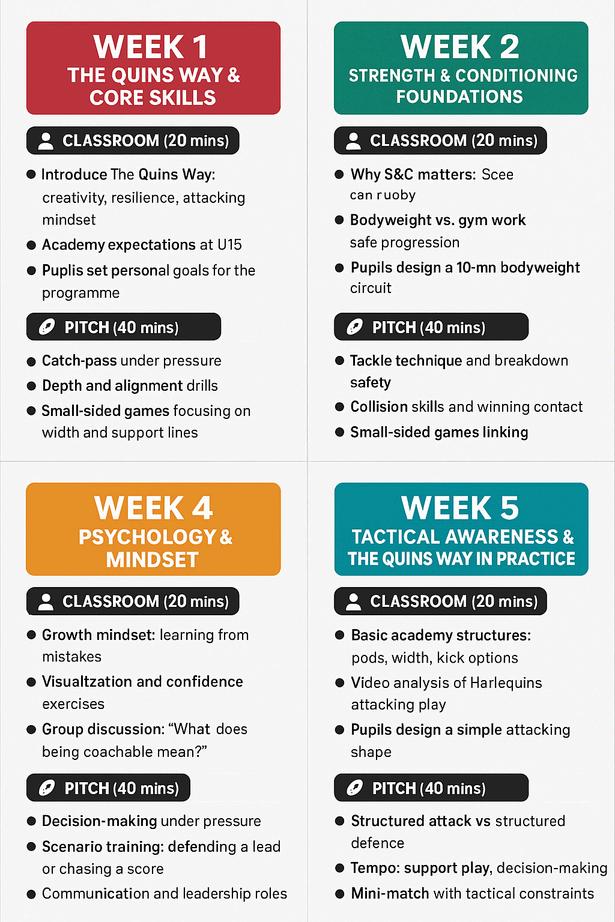 Discover what it really takes to be part of the Harlequins Academy. You’ll immerse yourself in high-quality sessions built around the Harlequins philosophy, developing skills, decision-making and game understanding. Along the way, you’ll learn about the physical, technical and mental elements involved in academy rugby. A brilliant opportunity for anyone who wants to train like a Quins player and push their game to the next level.