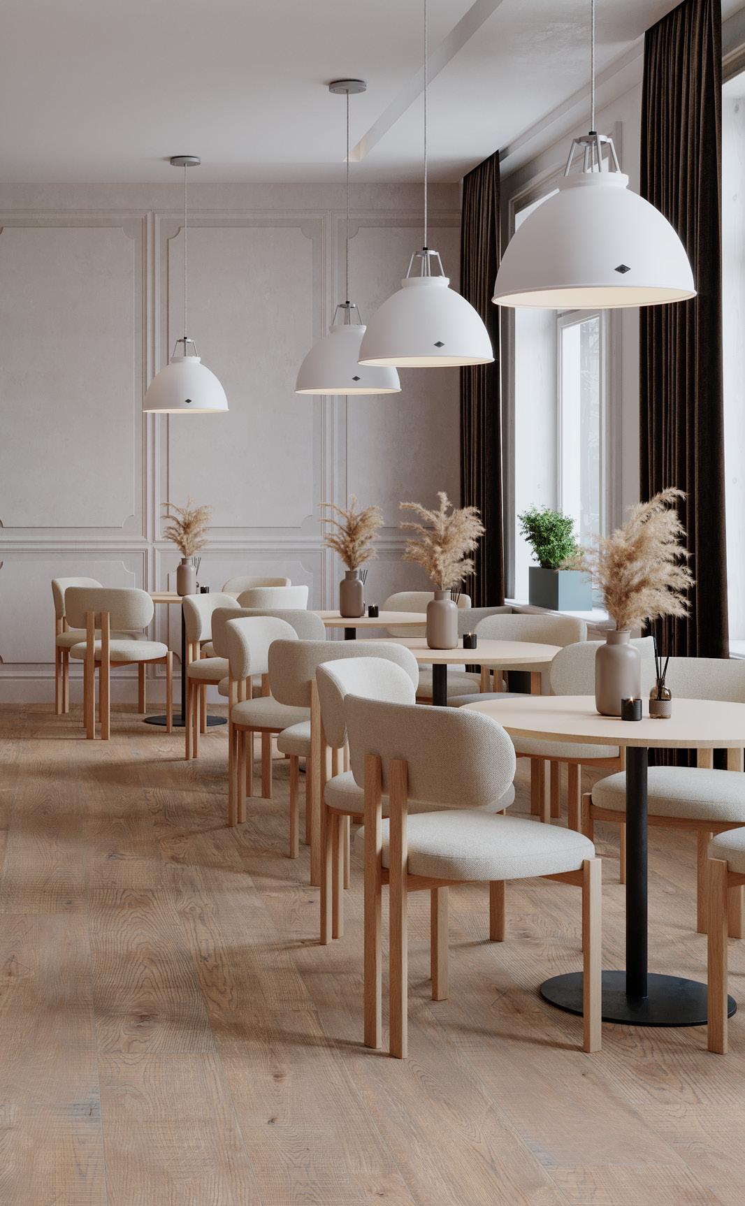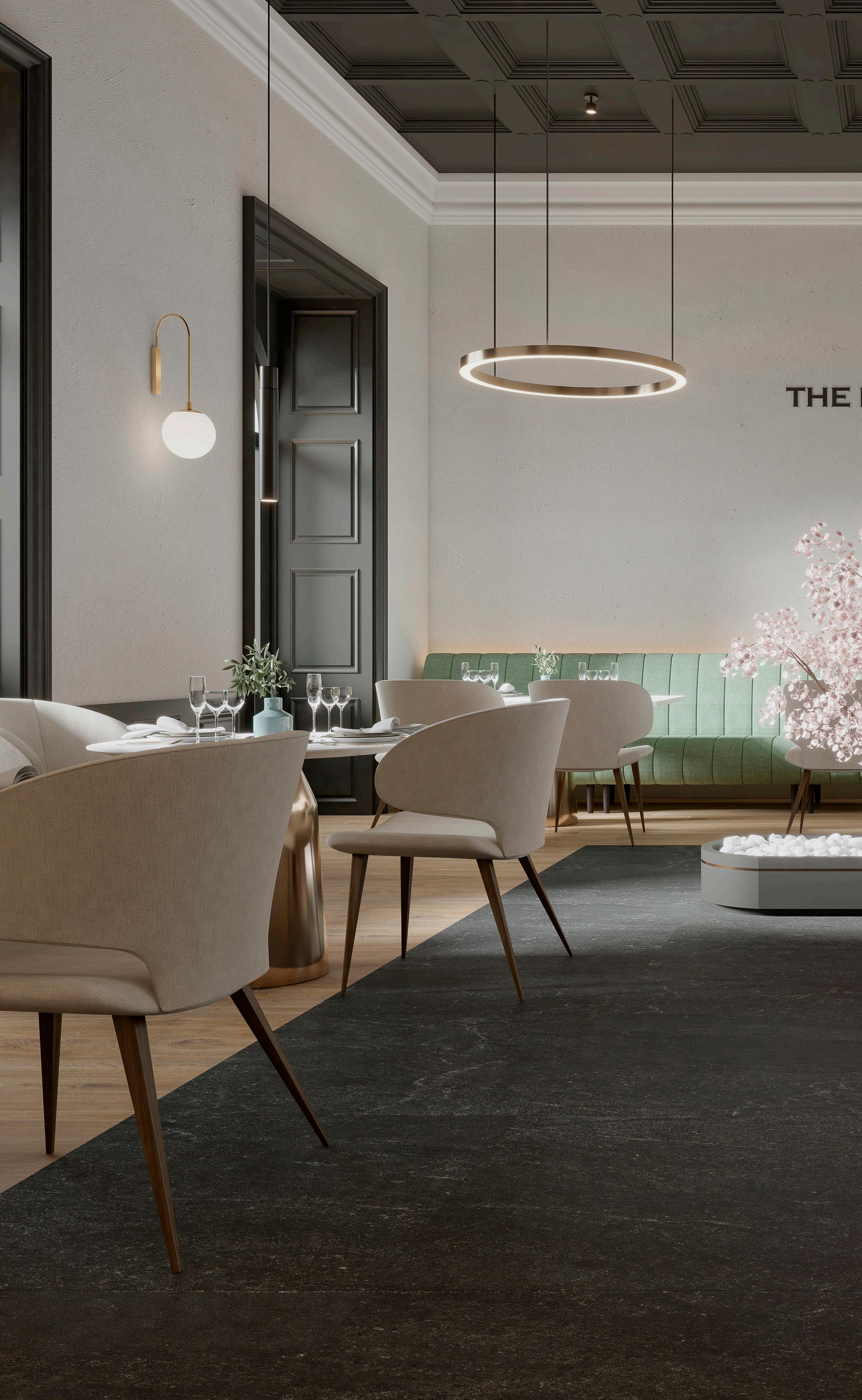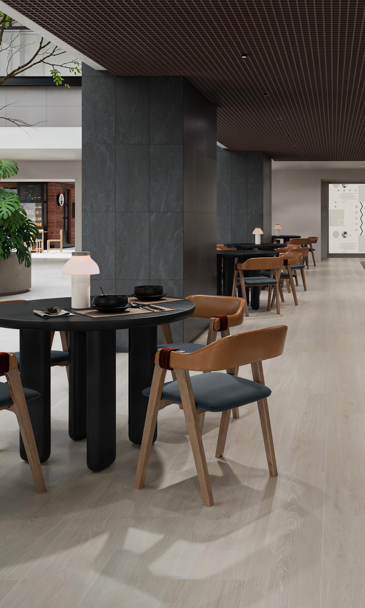 La resistencia al desgaste y la facilidad de limpieza hacen de estos materiales un aliado insustituible para zonas de gran tránsito. Además, la amplia variedad de texturas, patrones y colores su variedad estética permite crear ambientes que reflejen exactamente los valores de la marca: sobrios, cálidos, modernos o lujosos.