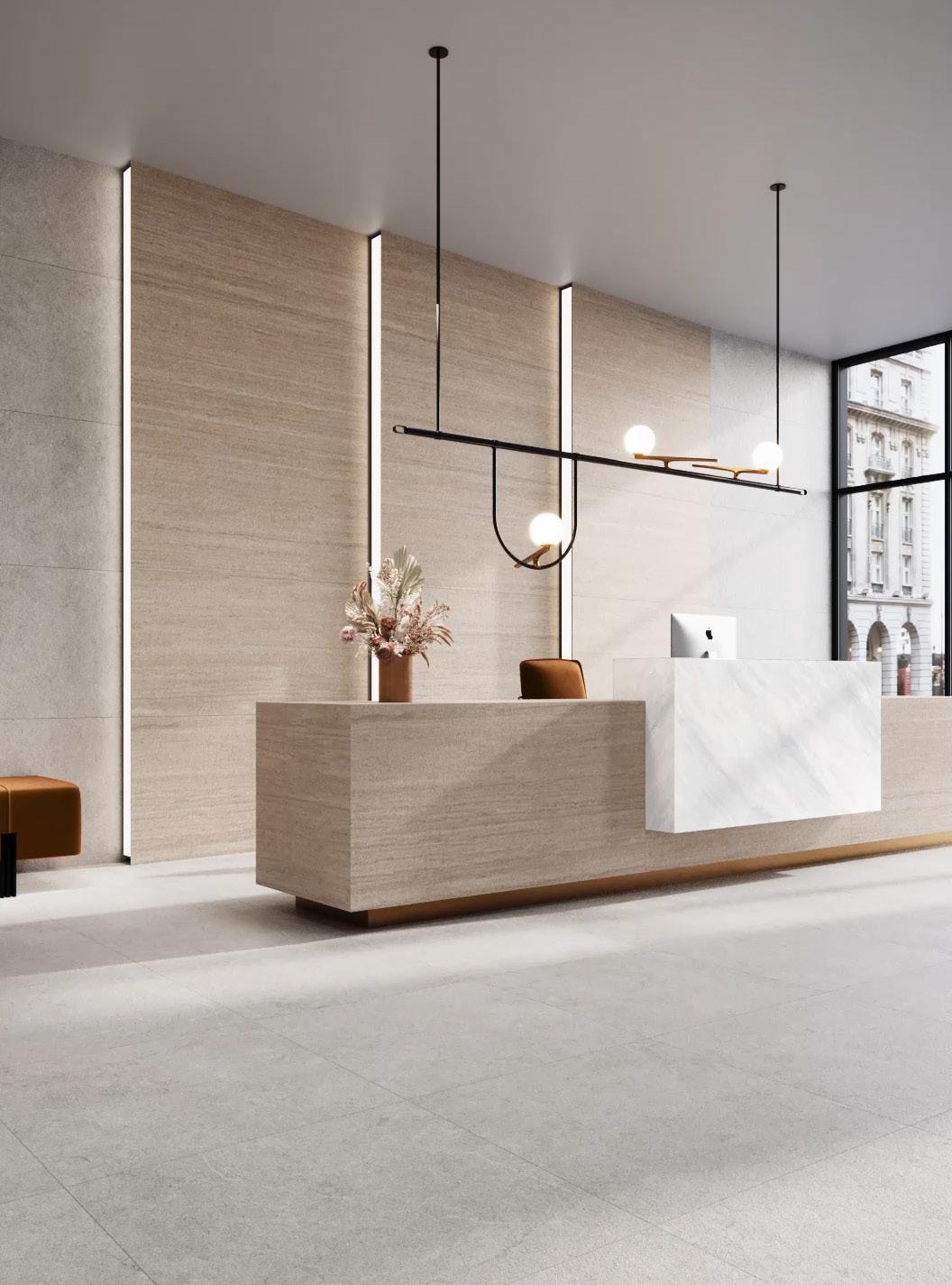 Ya sea por una noche, un fin de semana o una estancia prolongada, los hoteles deben dar la bienvenida con un entorno que combine confort y diseño. Los espacios comunes son la carta de presentación, y los cerámicos y porcelánicos son la elección perfecta para garantizar una impresión duradera.