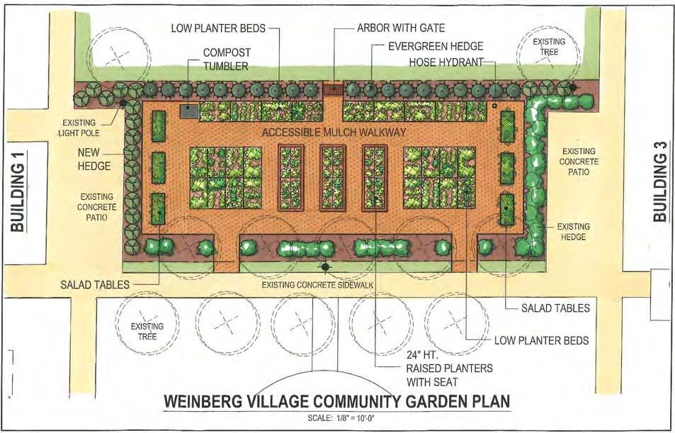 In 2012, the central courtyard of Weinberg Village has transformed from, as Gayle Newman, activities director said, “a living room covered in plastic that everyone looks at but no one uses, to a family room, filled with seniors working the land and building new friendships.” See the garden design on the previous page.