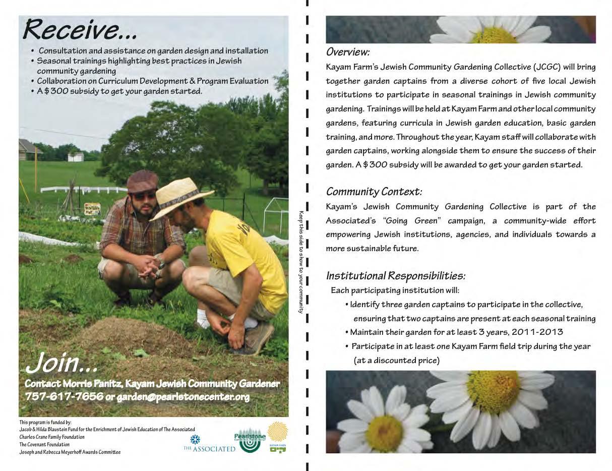 In December 2010, Pearlstone received a 2-year Signature Grant from the Covenant Foundation to create a Jewish Community Gardening Collective (JCGC) in Baltimore, Maryland. “The Covenant Foundation recognizes the diversity of strengths within the field of Jewish education in North America, across all denominations and settings. By honoring outstanding Jewish educators and supporting creative approaches to programming, the Foundation works to strengthen educational endeavors that perpetuate the identity, continuity and heritage of the Jewish people.”