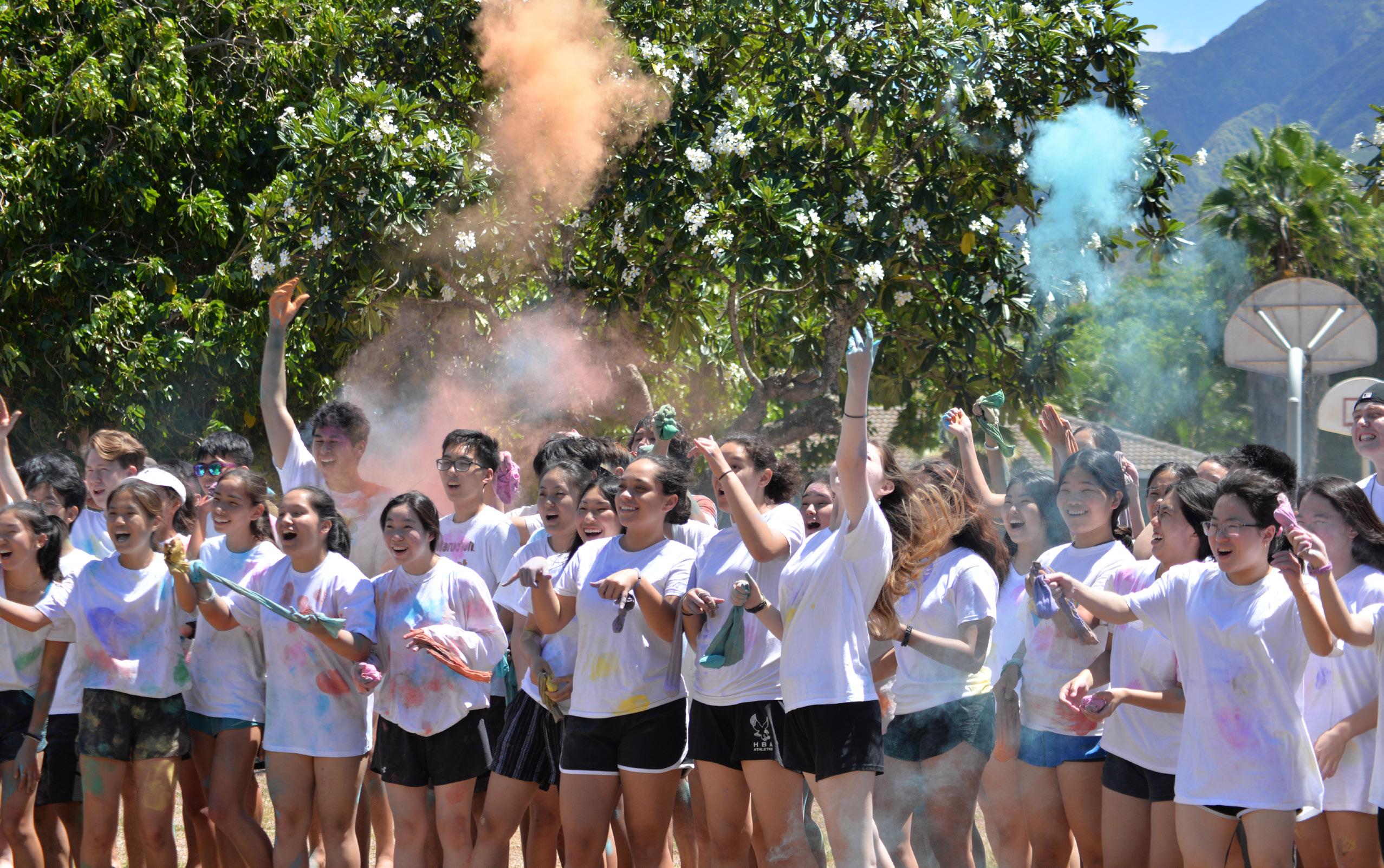 In what has become a senior camp tradition, a get-as-messy-as-youcan game was also on the camp schedule. Wearing white t-shirts, the seniors played a game of Color Wars, which involved hitting each other with pantyhoses full of colored powder. Noah Hu said, “I liked being able to run around on the field hitting my friends—in a friendly manner—and watching the colors explode. I felt like a little kid again.”