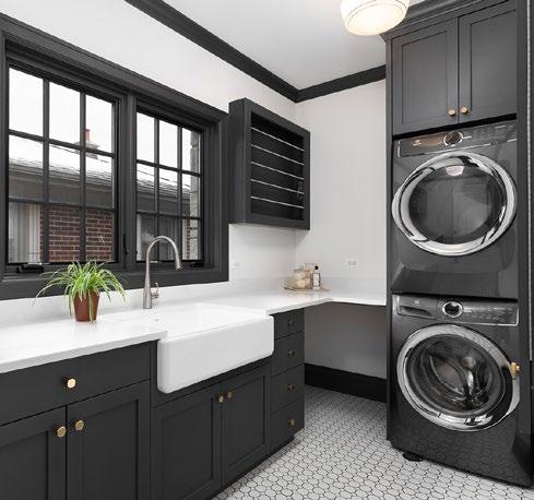 A renovated laundry room with dark grey cabinets, Electrolux appliances, farmhouse sink, and marble countertops.