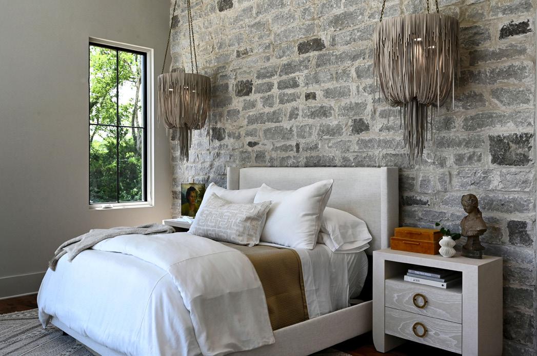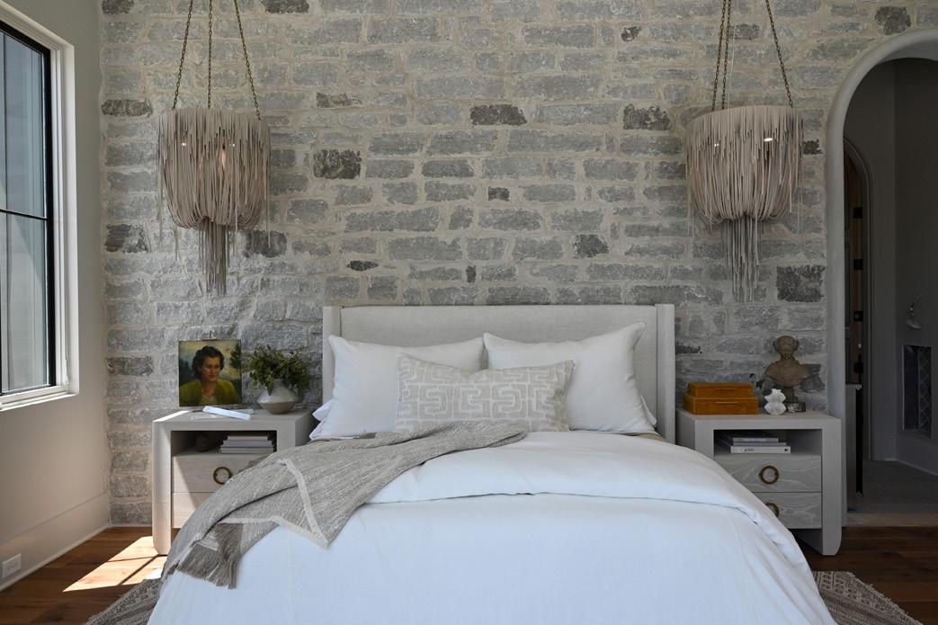 a stunning facade of brick with a handsome gray stucco finish that pops against the charcoal-colored shingles and dark downspouts. Paver-topped brick steps lead onto the front porch and under a bril liant limestone entry outfitted with gas lanterns. Enter the FOYER onto gorgeous white oak floors that stretch throughout the main level. To the right find the Study, and to the left a hallway leading to the main floor Guest Room. Don’t miss the custom artwork by Ed Nash found throughout the home. The well-appointed STUDY features exquisite millwork detail and enjoys access to the fabulous courtyard. An attractive lighting fixture from Ferguson hangs above a black steel canopy bed in a GUEST ROOM that features a 5-star level private bath. Down the hall and past an amazing custom-built-curved stair case with iron stair railing, the formal DINING ROOM is a must-see! A dazzling Golden Autumn chandelier illuminates the honey blonde oak finish of the dining table set and the luxurious plush blue side chairs. A gorgeous, show-stopping mural graces a full wall and the walk-in WINE ROOM is conveniently located nearby. The spacious FAMILY ROOM features a stunning Arccustone fireplace, a stylish sofa, and swivel barrel back chairs in a handsome weathered gray finish. The area enjoys an abundance of natural light and opens to a covered porch and courtyard with goat turf. Exquisite trim detail is found throughout a GOURMET KITCHEN boasting top-of-the-line Viking appliances and a behind-the-scenes SCULLERY with custom cabinetry and appliances. Soft brass pendant lighting hangs above an island perfect for entertaining or preparation. The attractive Breakfast Room includes a circular, country-style white oak table with stunning dark walnut chairs. The home features three separate OUTDOOR LIVING AREAS, including two handsomely manicured Courtyards and a back porch with both an Outdoor Entertaining Room and a Goat Turf Putting Green. Developed to perform as close to professional-grade natural golf grass for true ball-roll and realistic performance as possible, the putting green promises to be a popular attraction! An elegant MASTER SUITE contains its own Sitting Room and Coffee Bar, and His and Her wardrobe closets. The MASTER SPA BATH has a spa cious shower and a free-standing tub. The main level RETREAT is a true “man’s space” with multiple television, a wet bar, and a magnificent custom pool table from Nashville Billiards. The room enjoys access to the second courtyard, Work Shop, Gardening Room, and 2-Car Garage. Upstairs, an inviting LOUNGE AREA sits atop the second-floor landing and boasts peacock velvet and dark walnut lounge chairs. A delightful Girl’s Bedroom features a queen bed with white lacquer nightstands and a waterfall chest dresser with a fluted drawer front. The Boy’s Bedroom includes a metal Queen Bed with a sleek River Bank finish and a Benjamin side table in navy blue. All upstairs bedrooms enjoy private baths, including an elegant GUEST ROOM. The UPSTAIRS BONUS ROOM features amazing custom wain scotting and is finished in a brilliant splash of blue, a perfect space for gaming or relaxing with friends and family. Charming Bunk Area transforms fun get-togethers into all-night slumber parties.