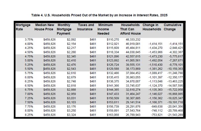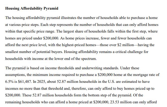 Housing affordability remains a critical issue, with 74 9%of U S households unable to afford a median-priced new home in 2025, according to NAHB?s latest analysis. With a median price of $459,826 and a 30-year mortgage rate of 6.5%, this translates to around 100.6 million households priced out of the market, even before accounting for further increases in home prices or