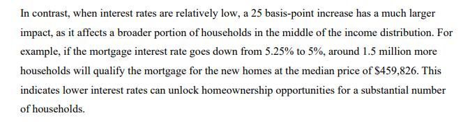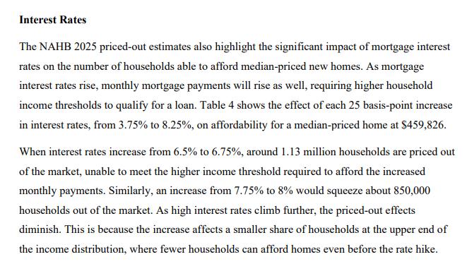 - A 25-basis point rise in the 30-year fixed mortgage rate (from 6.5%to 6.75%) would price approximately 1.1 million households out of the market.