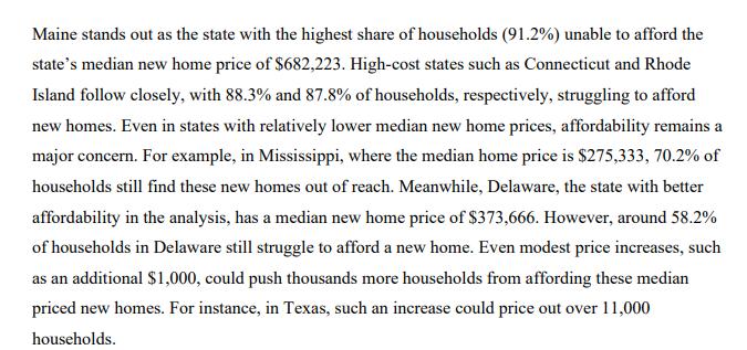 Under the assumption of a 6.5%mortgage rate, the minimum income required to purchase a new median-priced home value at $459,826 in 2025 is $141,366. At this income threshold, around 100.6 million U.S. households, or 74.9%of the total 141 1 million households, would be unable to afford this home, shown in Table 1 A $1,000 increase in the home price increases the minimum income needed to $141,674, pricing out an additional 115,593 households. This calculation shows that even slight increases in housing prices can have a significant impact, pushing more households beyond the threshold of affordability.