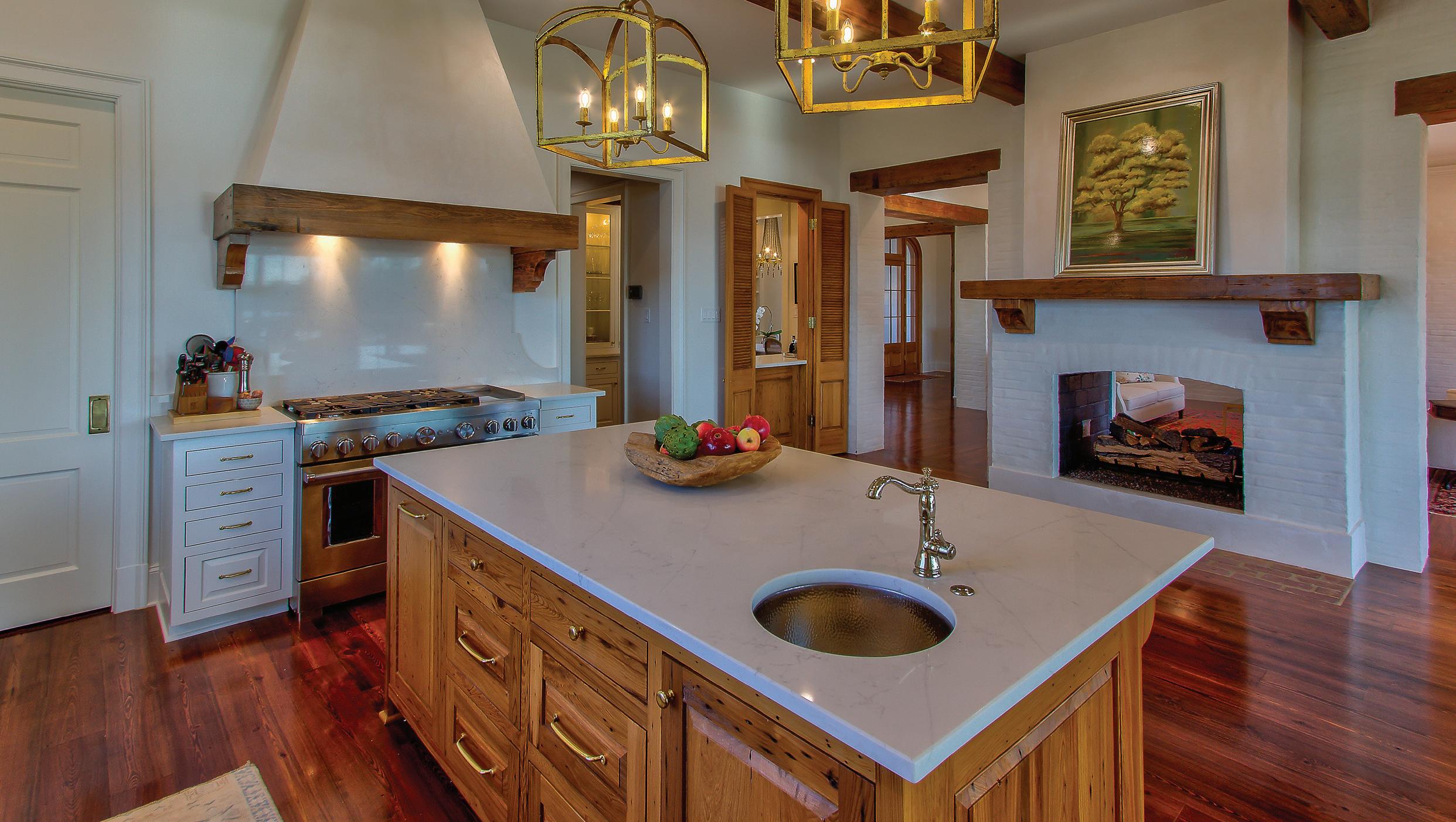 This edition’s cover image features an addition to a home originally built in the late ‘90s in south central Lake Charles in the country French architectural style characteristic of lake area and Lafayette construction in the ‘90s. The homeowners wanted an inviting space extending the west-facing footprint of their home where they could unwind and enjoy their landscape, including a beautiful oak tree. The pre-existing, minimal porch was expanded with heavy antique beams and a stunning wood-burning fireplace as its centerpiece, coordinated with the brick exterior of the home