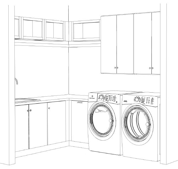Reflecting the use of this space, the laundry room focuses on polished look with marble patterened accents and bright whites.