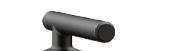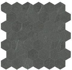 This bathroom continues similar features with black accents and white countertops. The continuous dark floor tile and hexagon shower pan add interest and a personalized touch.