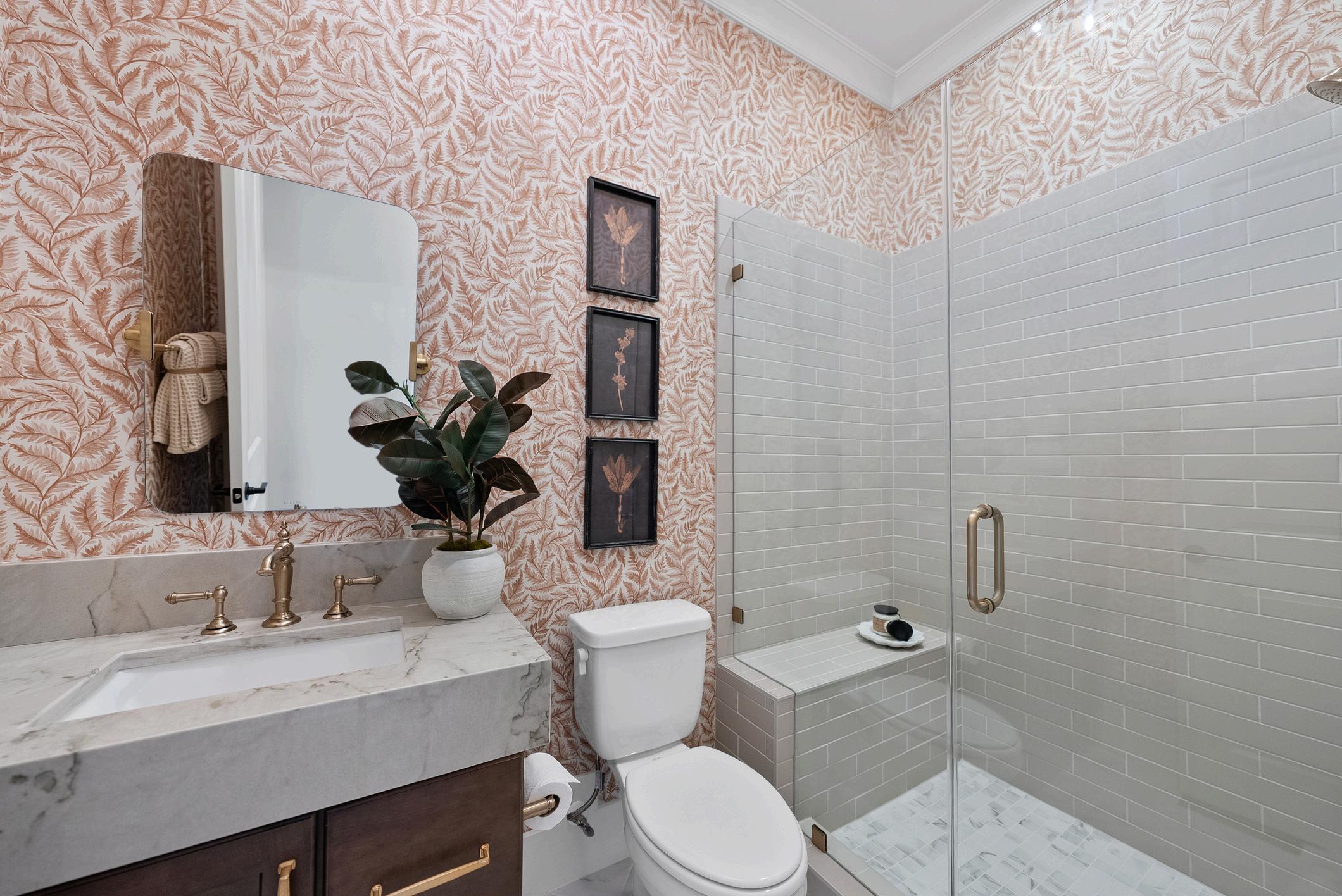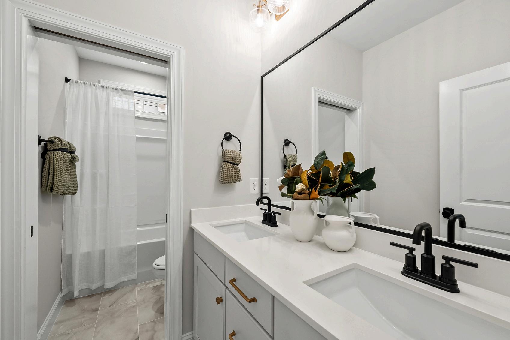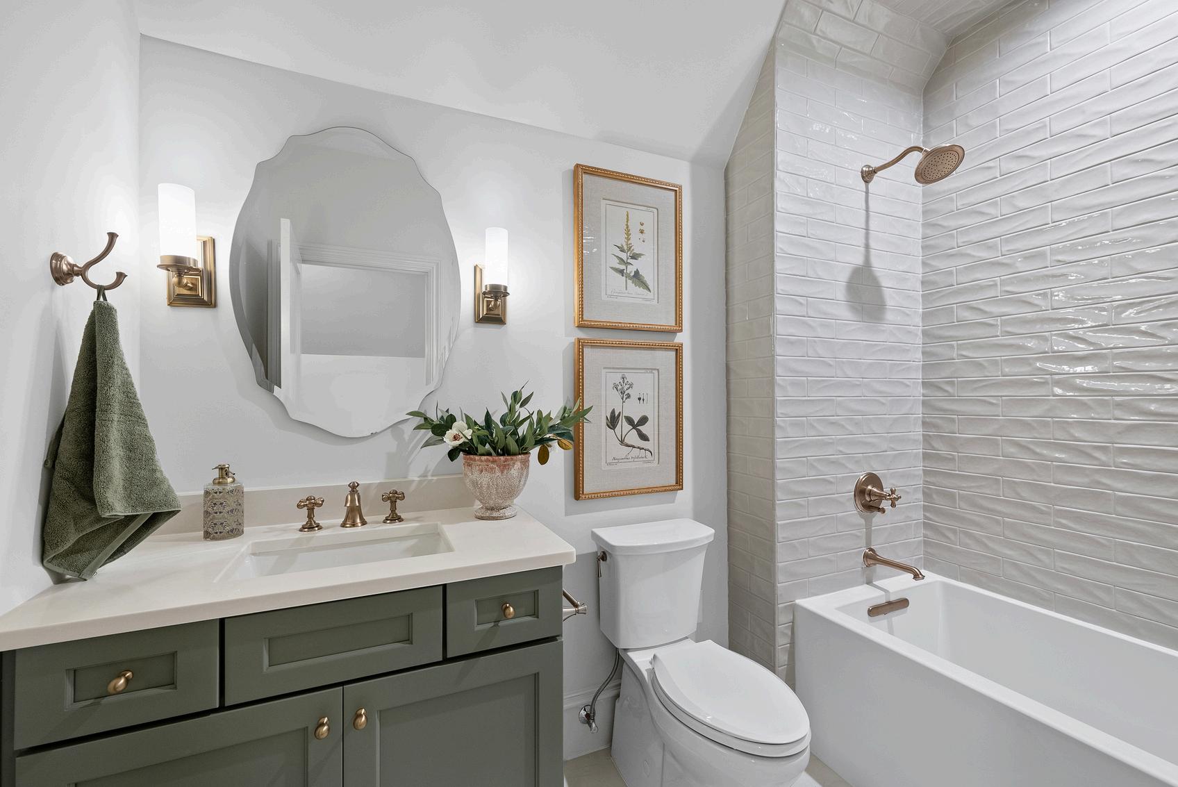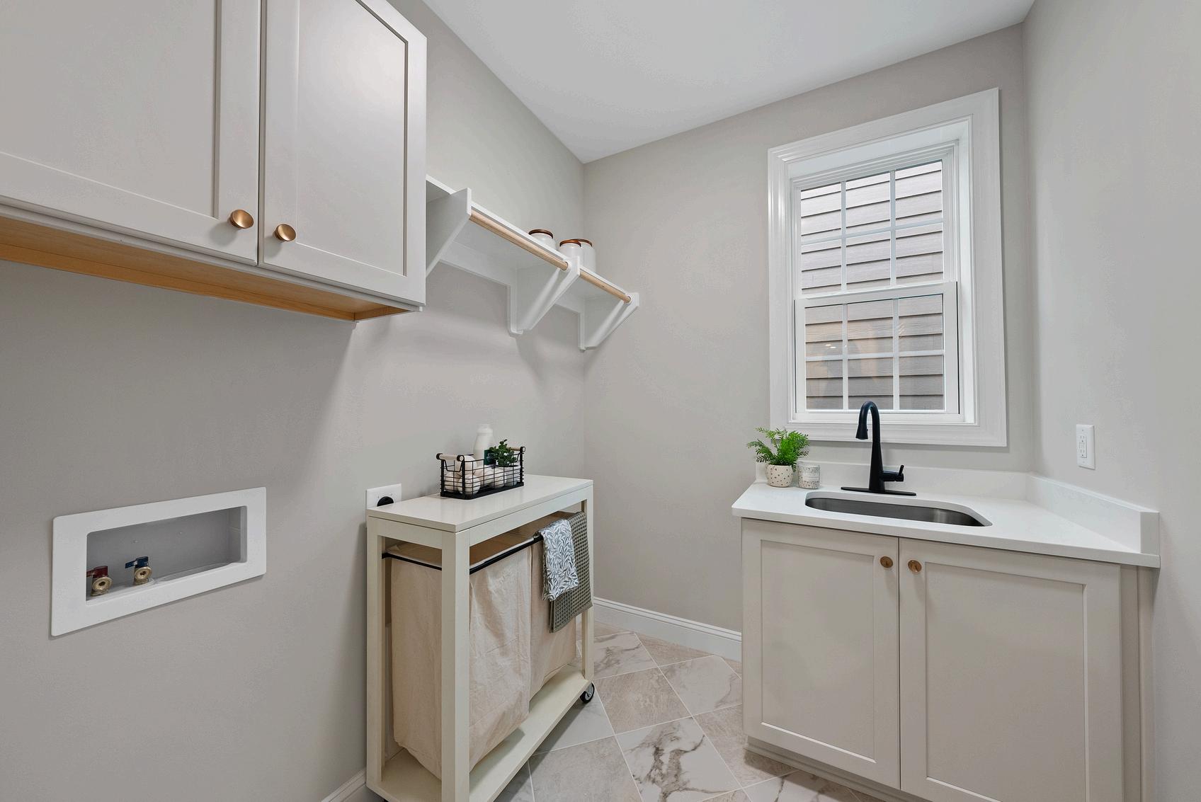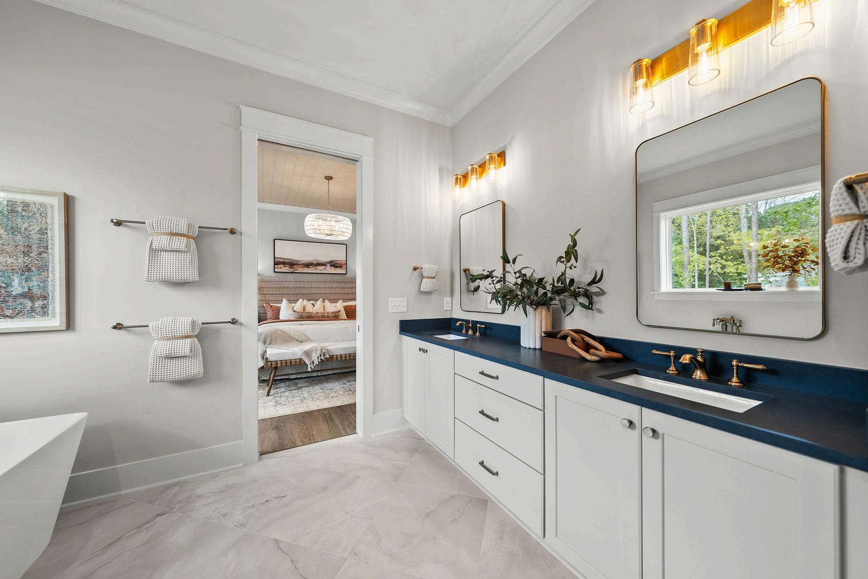 The style of Spill the Tea blends rustic French country elegance with the small-town Southern charm of Wendell, North Carolina. Wide-plank mid-tone flooring flows across the first floor, grounding the home in timeless appeal A twostory kitchen filled with natural light serves as its heart, featuring a quartz countertop backsplash with a ledge in place of traditional tile and a thoughtful mix of cabinet colors in alabaster, river rock, and mid-tone stain Sage green accents appear throughout the design, from the powder room’s wallpaper and wainscot ceiling to the primary bathroom’s two-tone shower tile. Metals in matte black and brushed brass layer in subtle sophistication, while a diagonal checkerboard floor from the powder room to the laundry room adds a playful touch of tradition reimagined.