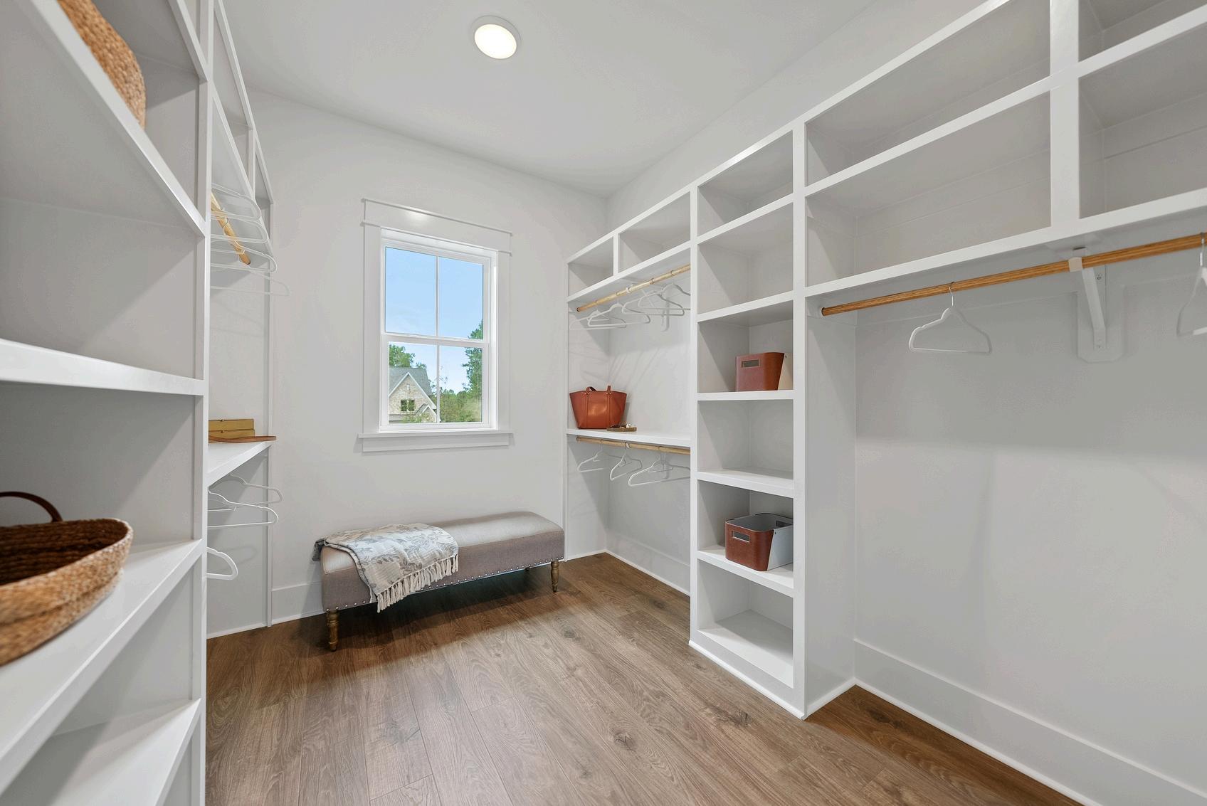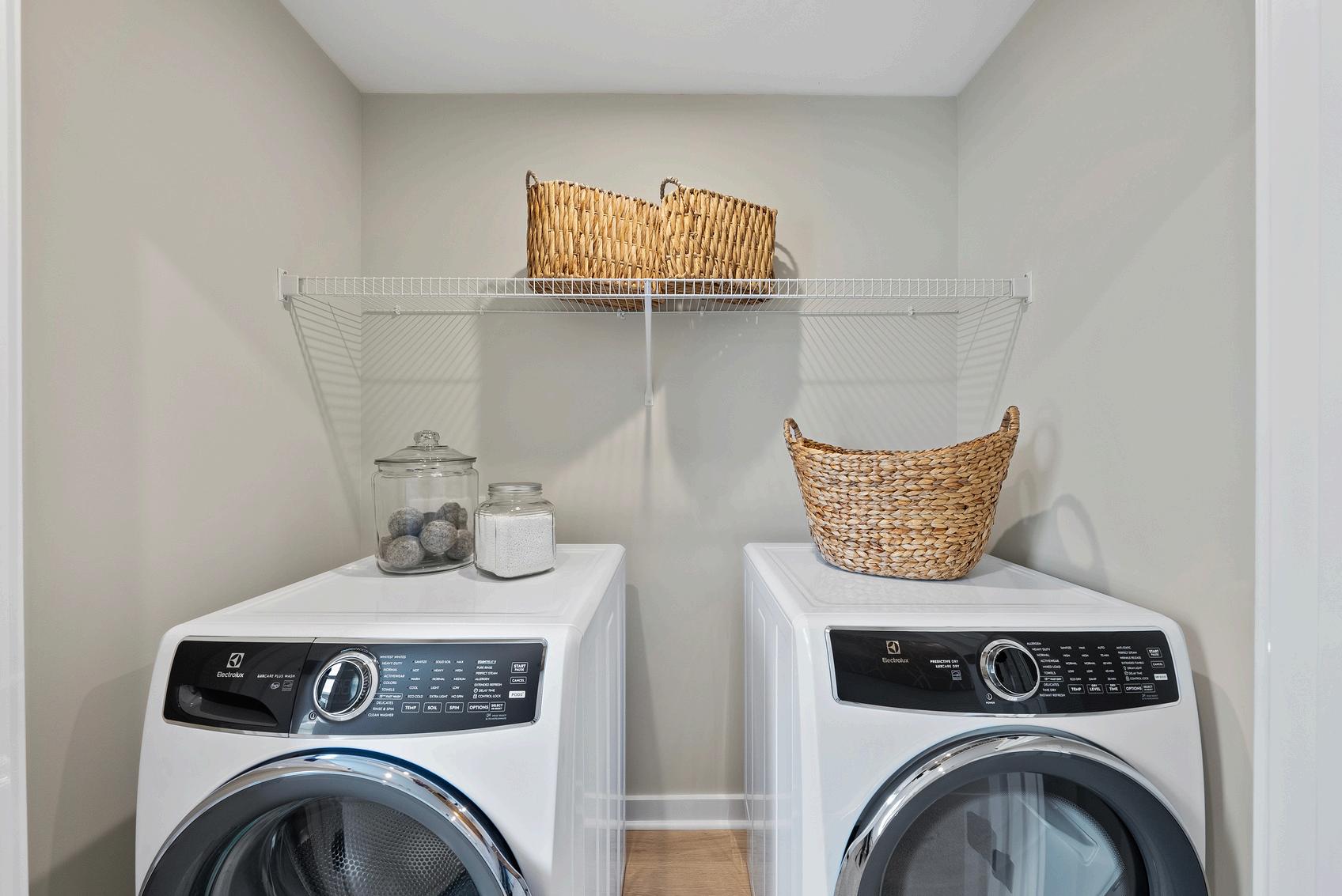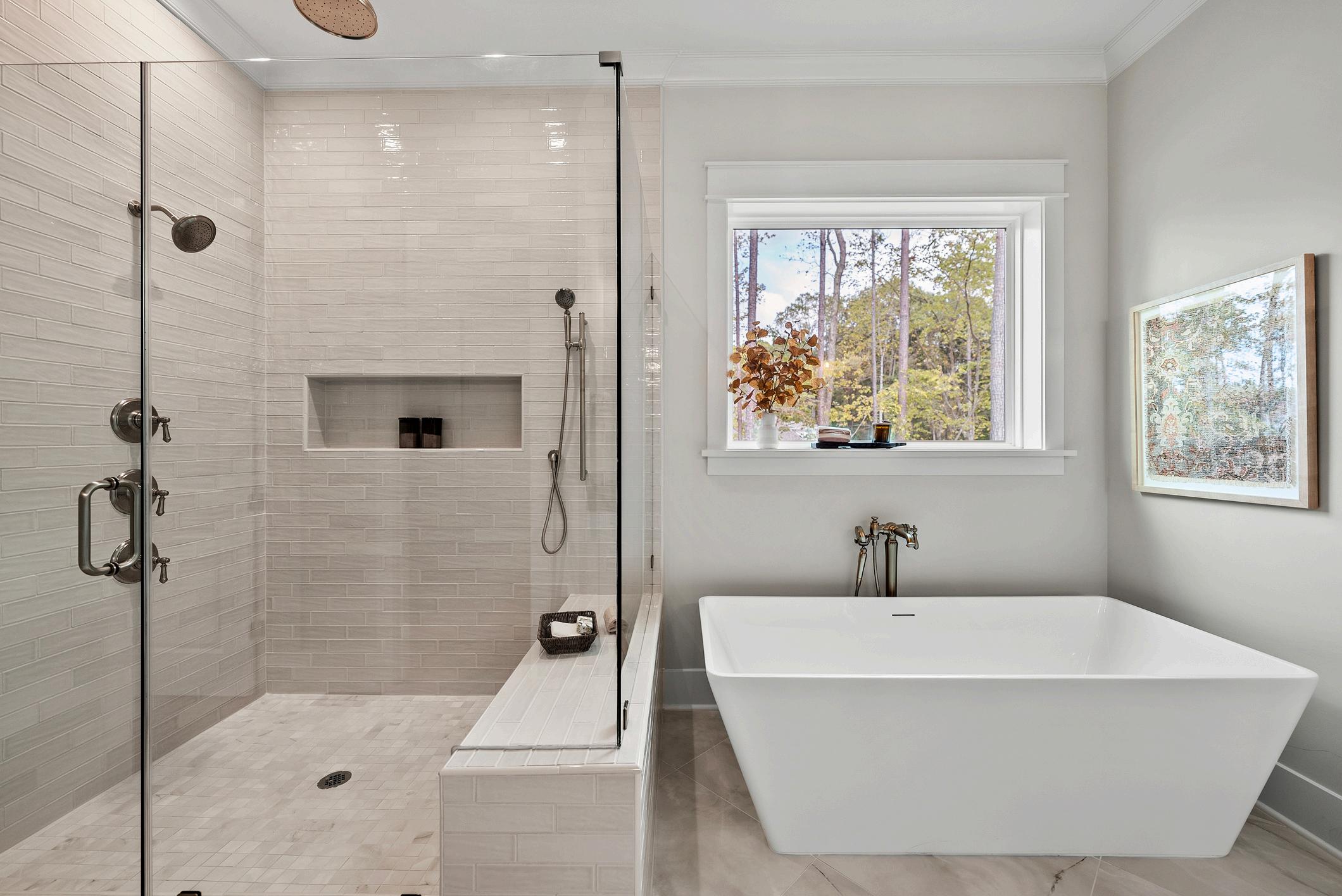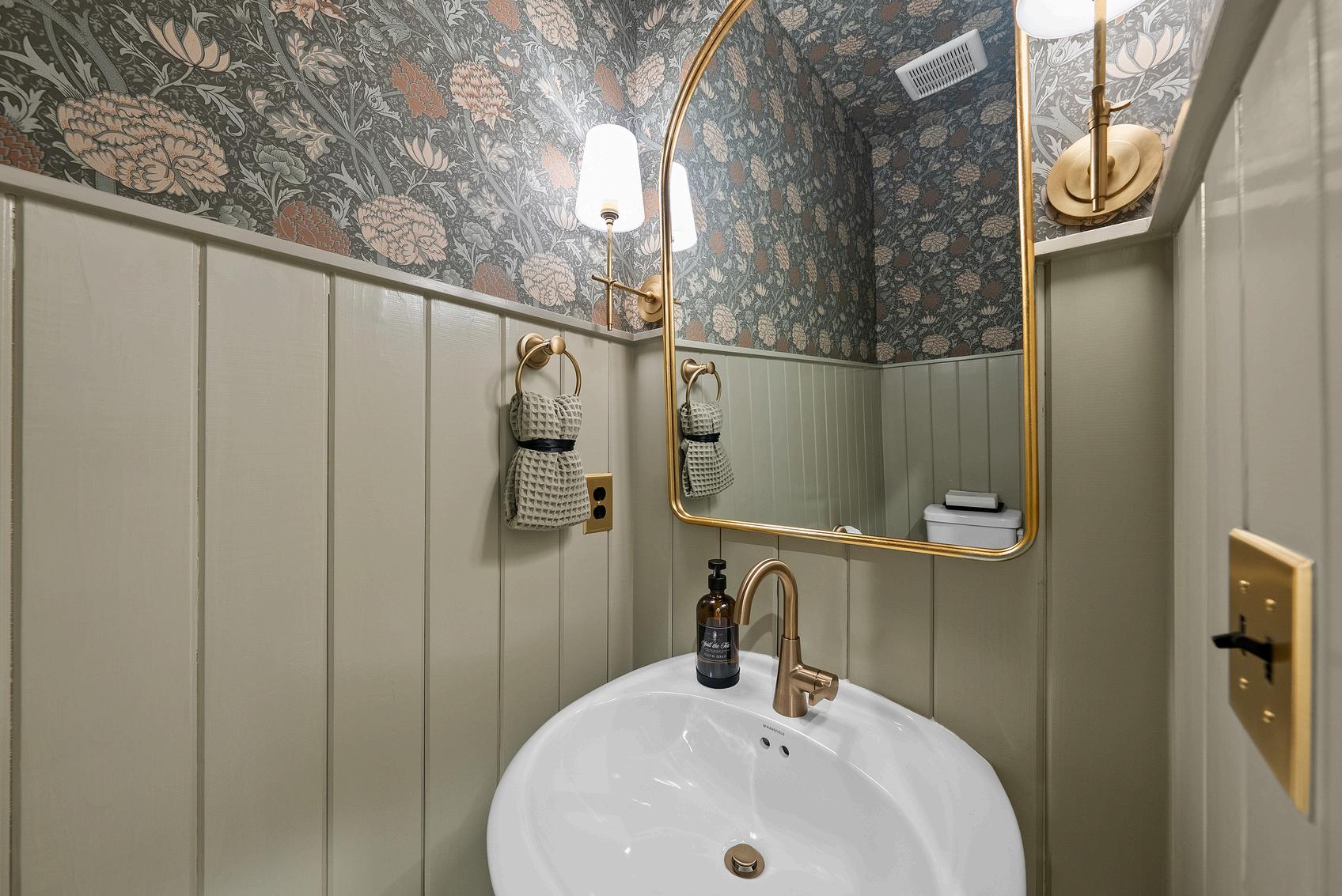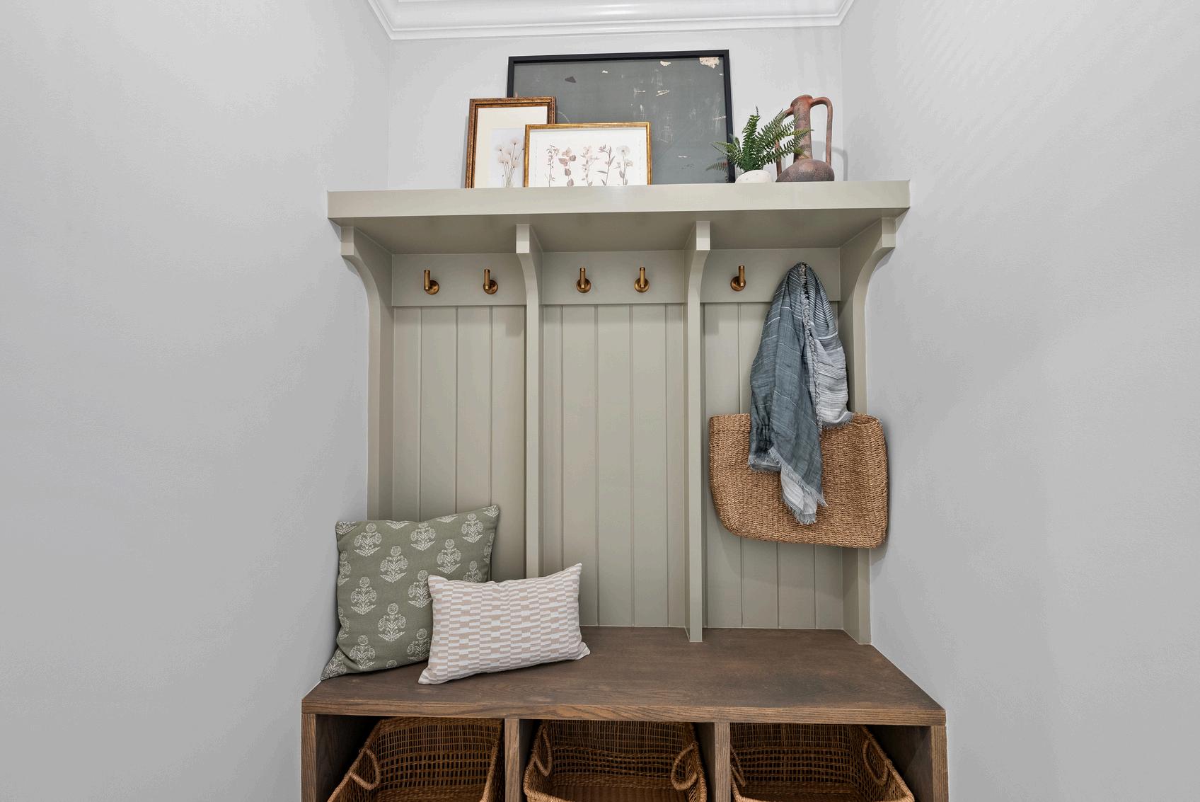 The style of Spill the Tea blends rustic French country elegance with the small-town Southern charm of Wendell, North Carolina. Wide-plank mid-tone flooring flows across the first floor, grounding the home in timeless appeal A twostory kitchen filled with natural light serves as its heart, featuring a quartz countertop backsplash with a ledge in place of traditional tile and a thoughtful mix of cabinet colors in alabaster, river rock, and mid-tone stain Sage green accents appear throughout the design, from the powder room’s wallpaper and wainscot ceiling to the primary bathroom’s two-tone shower tile. Metals in matte black and brushed brass layer in subtle sophistication, while a diagonal checkerboard floor from the powder room to the laundry room adds a playful touch of tradition reimagined.