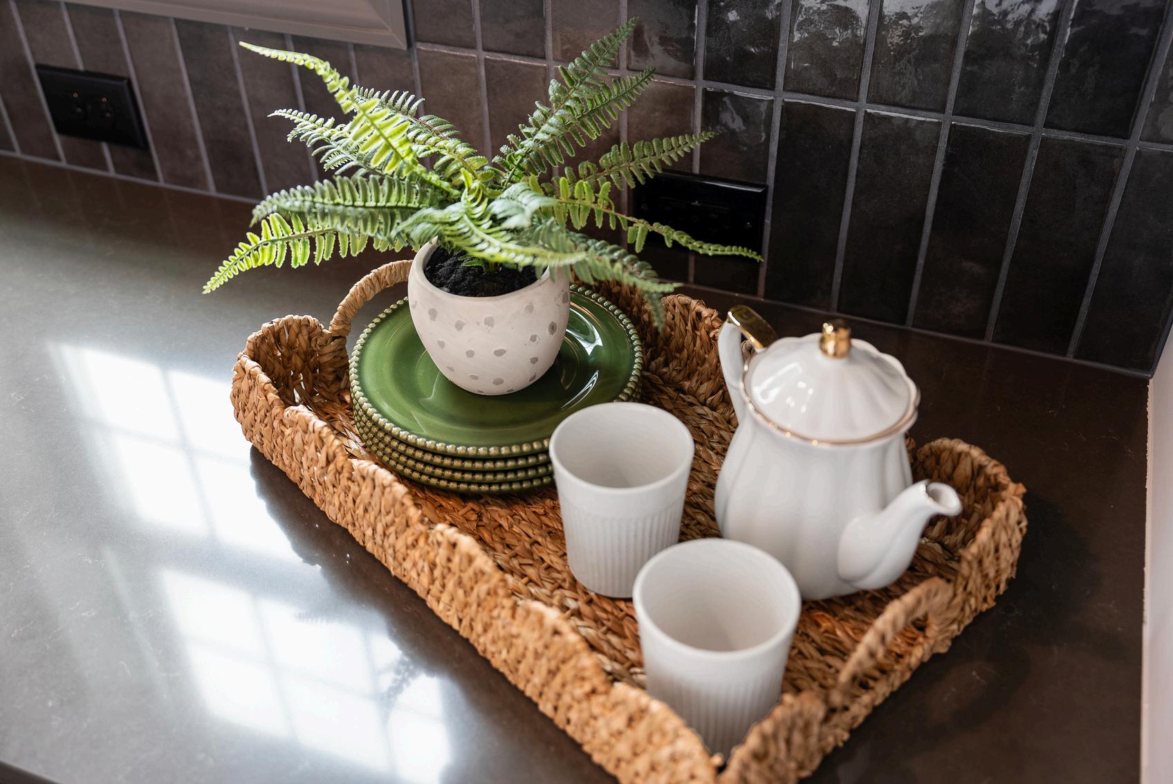 “FOR THE INSPIRATION, I ENVISIONED A GROUP OF CLOSE FRIENDS GATHERING AROUND THE KITCHEN ISLAND OR PORCH AND FILLING EACH OTHER IN ON THEIR WEEKS. SO IN OTHER WORDS, SPILLING THE TEA.”
