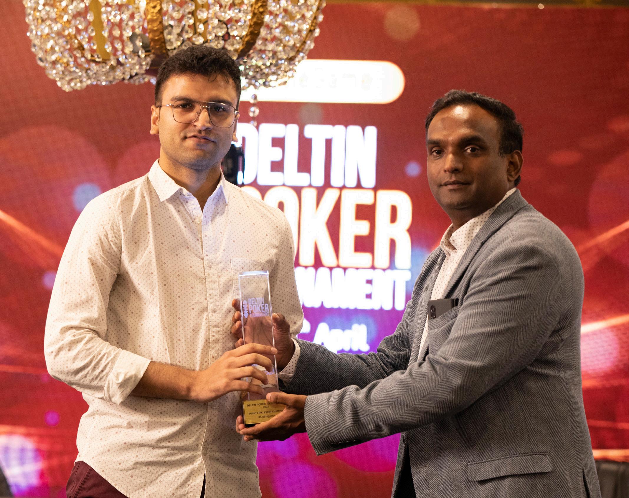 Praveen Dwakanath, Poker Head, Deltin presents the trophy to Amit Kaushik
