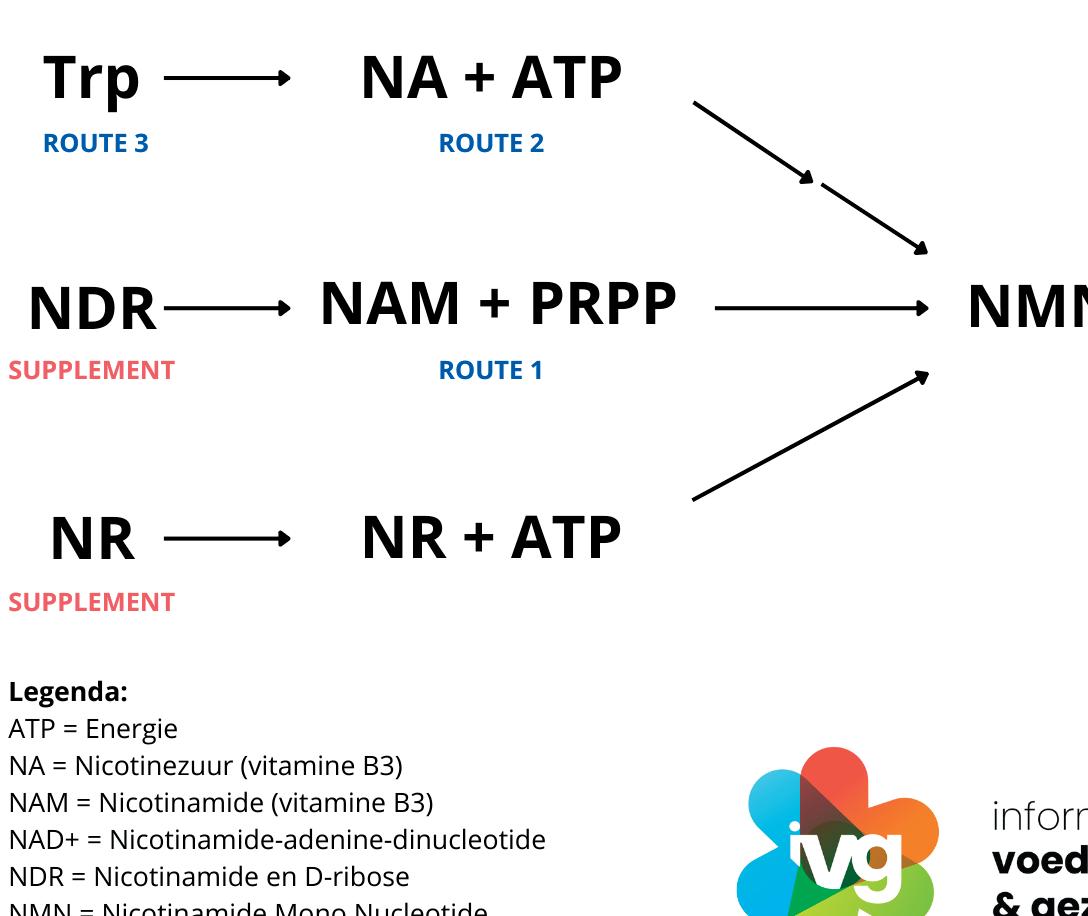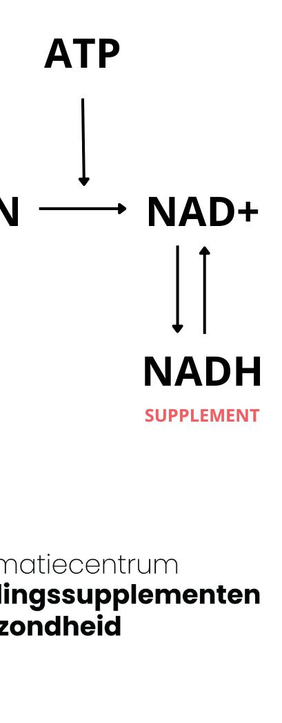 • Bij de tweede route wordt nicotinezuur (NA), een andere vorm van vitamine B3, door middel van energie (ATP) via meerdere tussenstappen omgezet in NAD+.