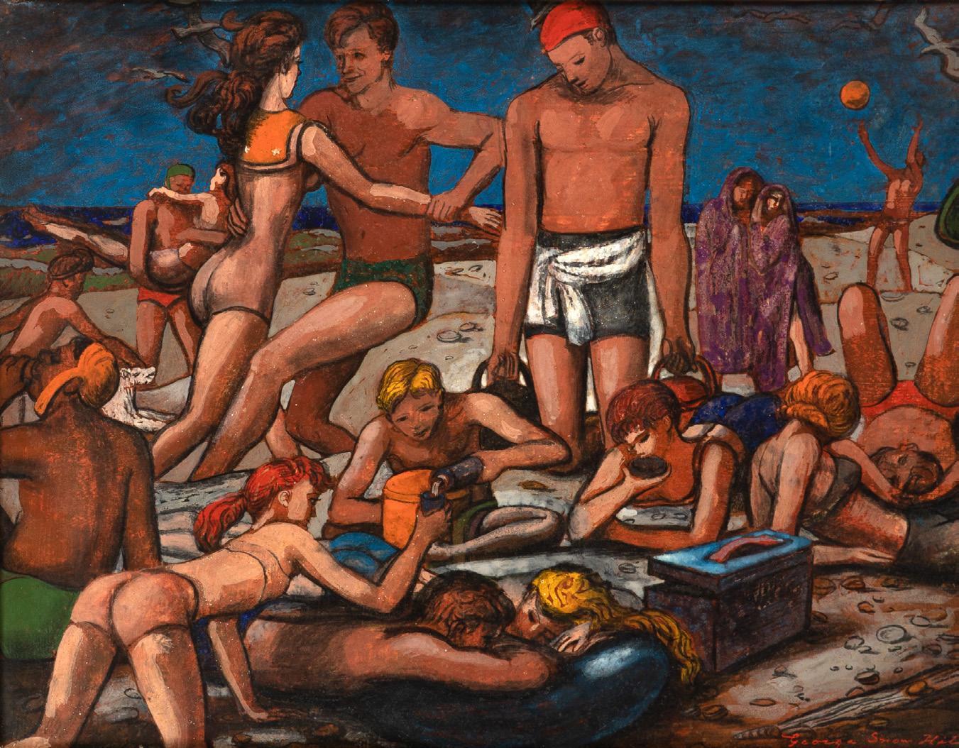 His painting showcases the beach revelry and joyful abandon that had already become emblematic of Florida tourism by the mid-20th century as vacationers and adopted locals like Hill made beaches a social center. Today, Florida remains a national epicenter of Spring Break tourism. Rather than scandalizing, much of the scene’s risqué subject matter remains visible today and has been fully normalized into Floridian culture, forging an enduring image of the Sunshine State: people on the beach while on vacation.