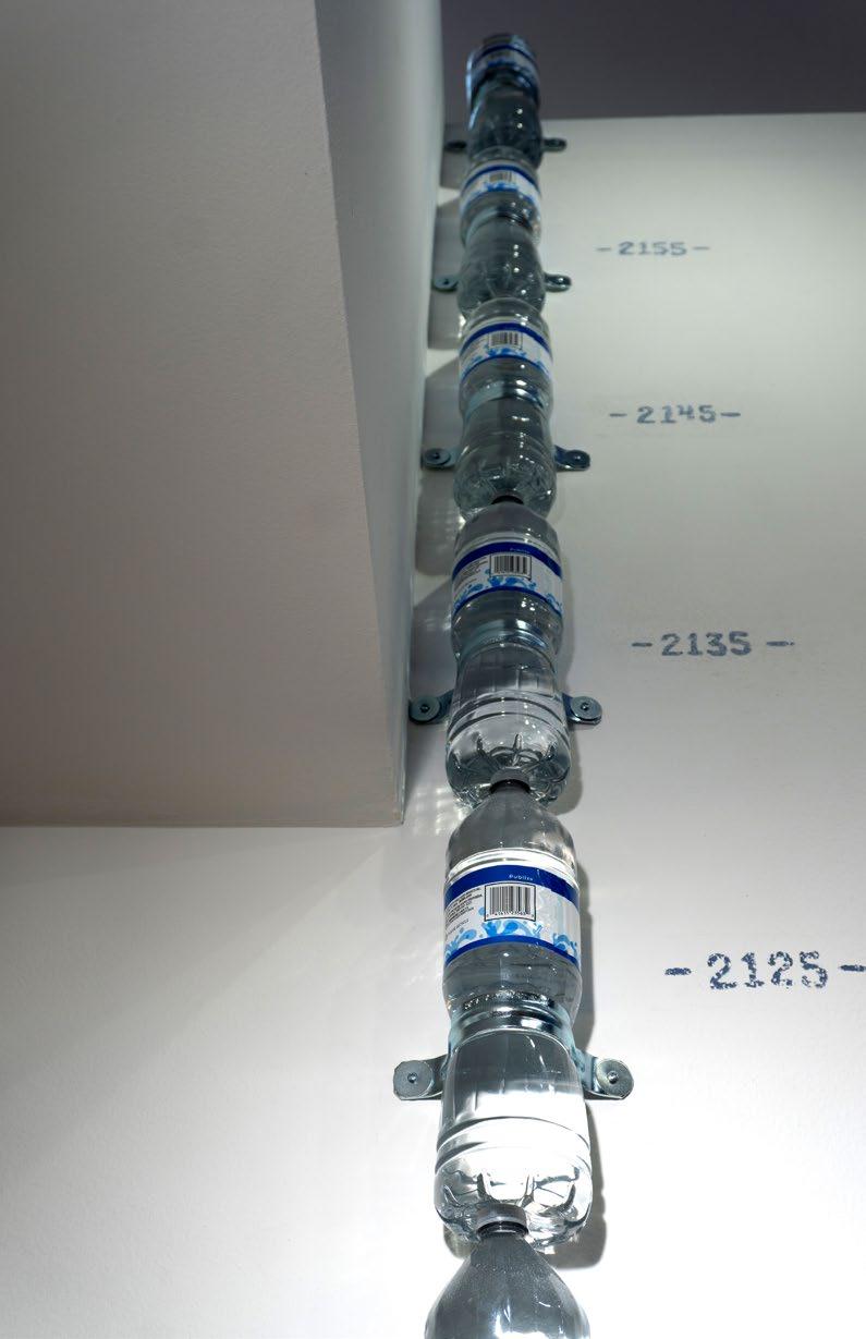Furthering this sense are 12 12inch water bottles attached to the wall in a vertical line, with years printed next to the bottles to show rising water levels up to the higher estimate of about 12 feet or more when accounting for unprecedented storm surge.