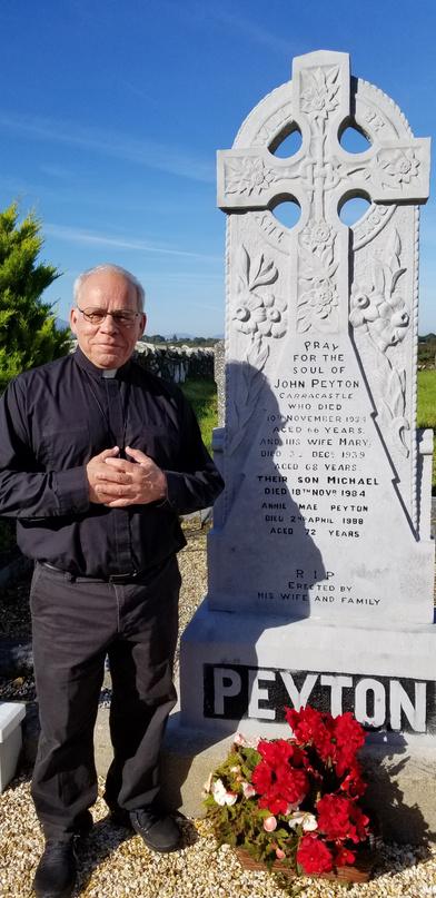 Father Willy Raymond C S C , at the grave of Father Peyton's father, John Peyton, in Ireland