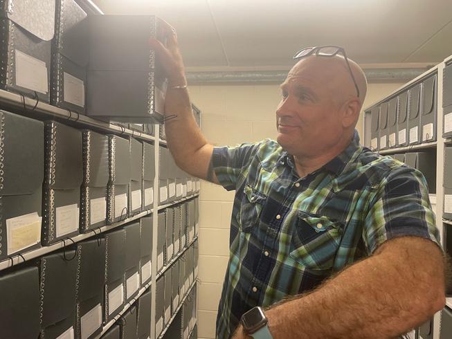 David Goodrich, Archivist, working in the archives at The Father Peyton Center in North Easton, MA