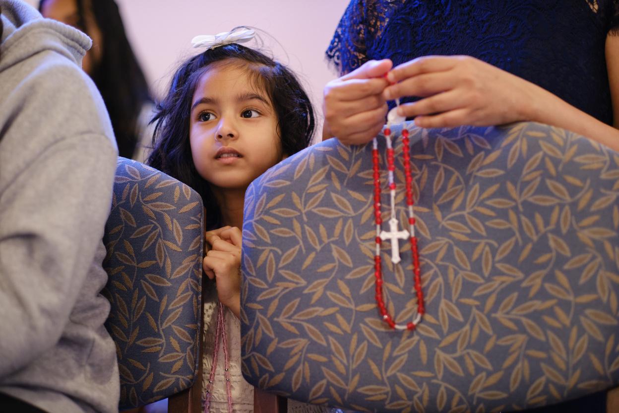 Young girl prays the Rosary with her family at the Father Peyton Family Field Day on June 17, 2023, at The Father Peyton Center in North Easton, MA