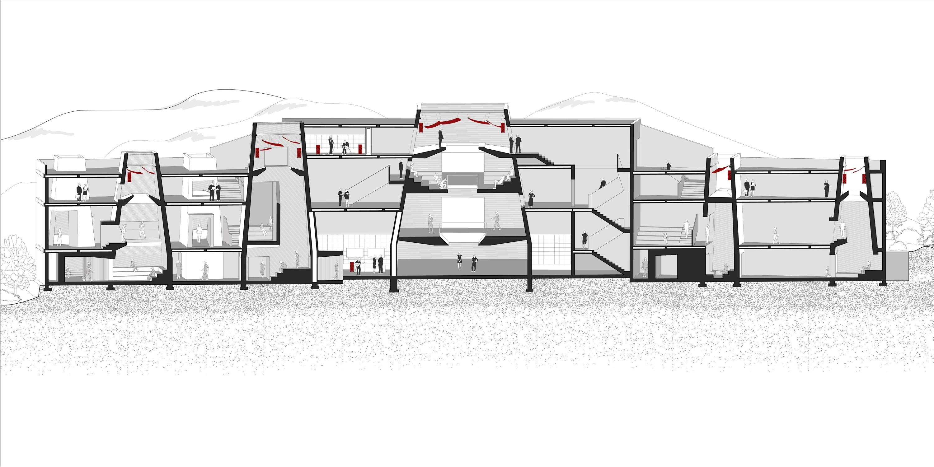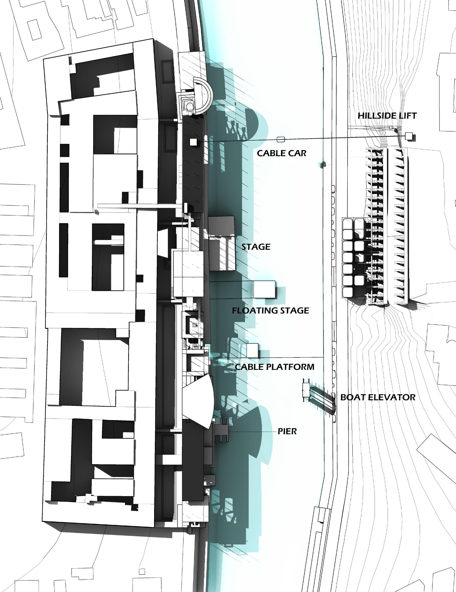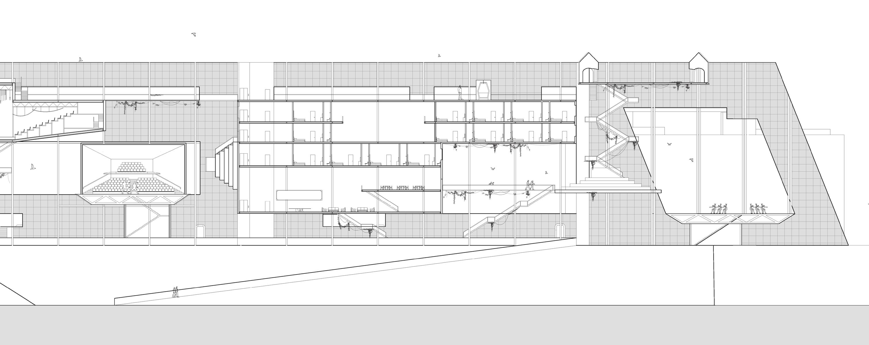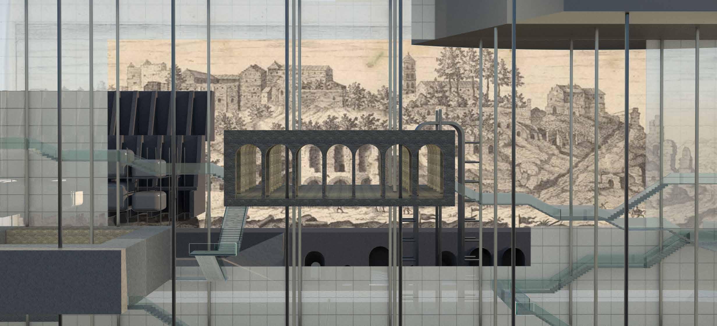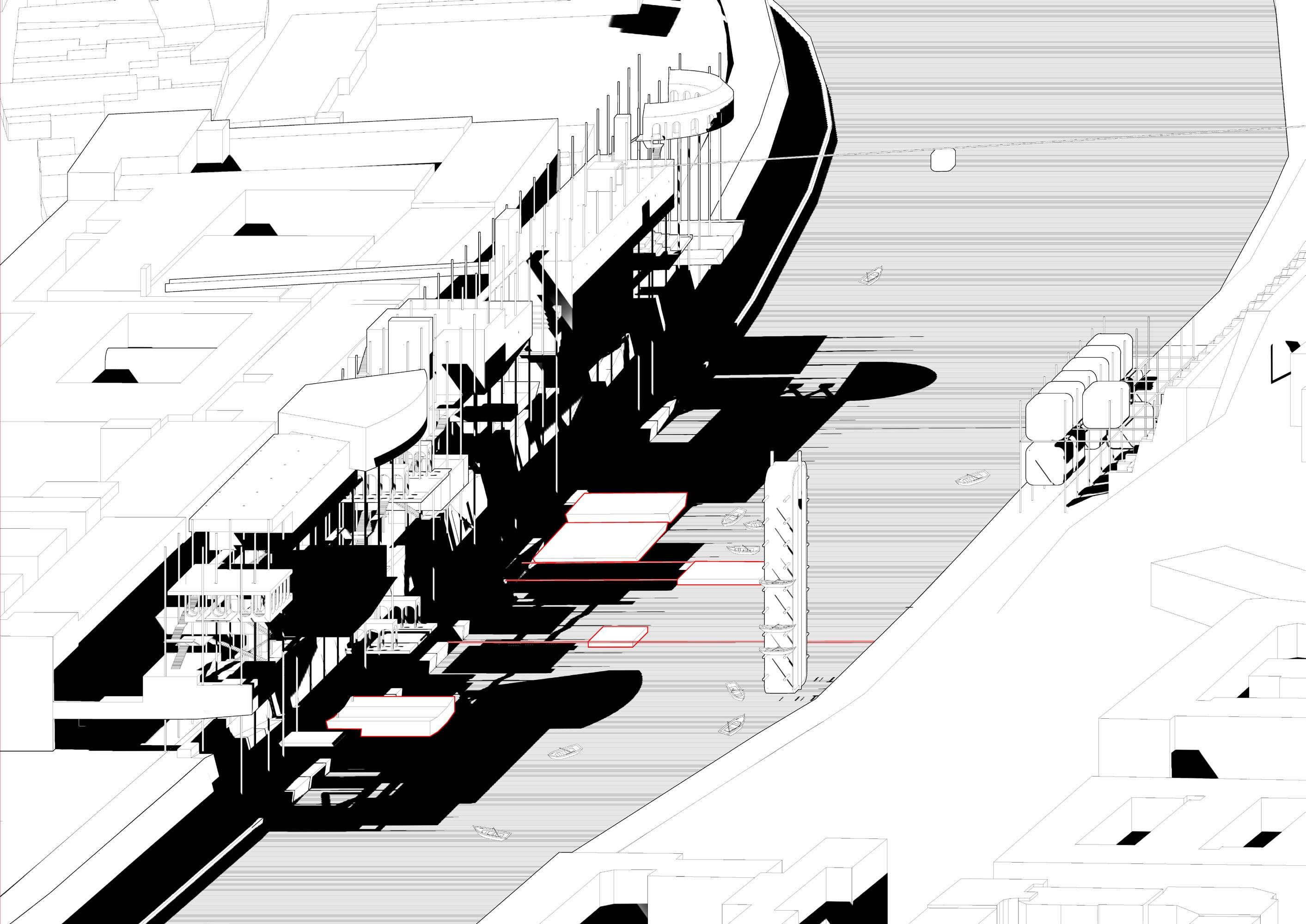 This building is located along the Tiber River in Rome, Italy. The design explores the verticalization of Rome’s urban fabric by reimagining the traditional piazza. Different prototypes of piazzas are stacked vertically, creating a unique spatial arrangement that accommodates a variety of uses, including performance spaces, theaters, performing Institute and Pilgrim Caravanserai.
