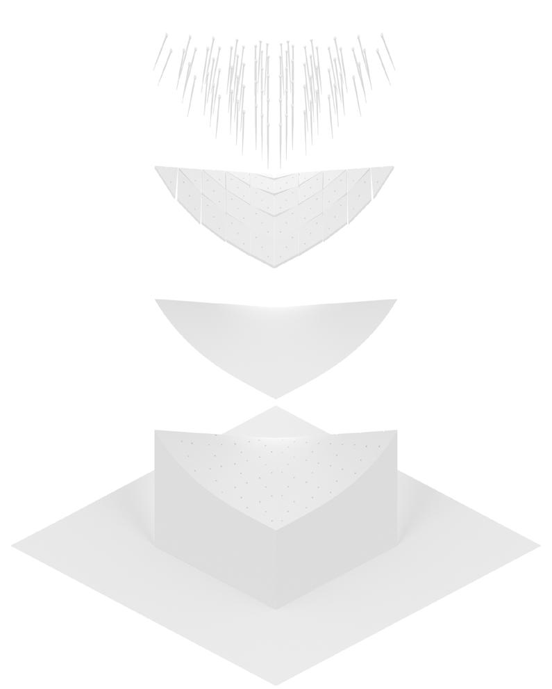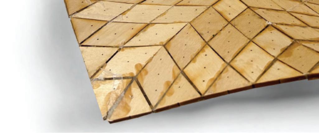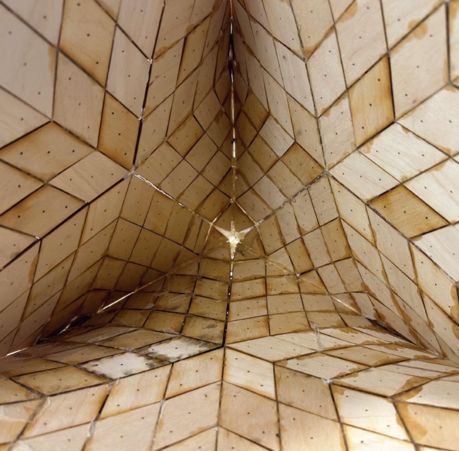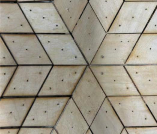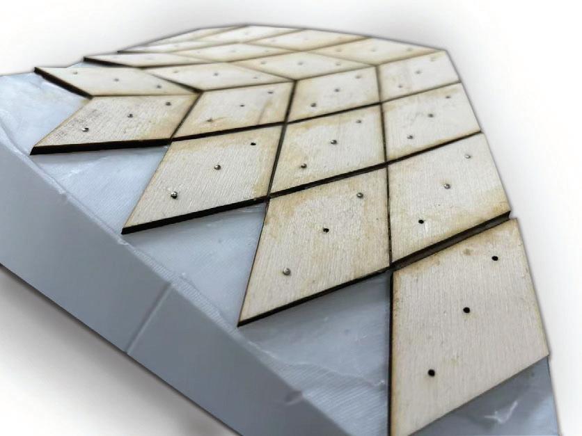 This studio focuses on exploring the representation of form and space through minimal surface geometries, with this semester’s emphasis on the Diamond Lattice structure. Our goal is to replicate the smooth, continuous surfaces designed in Grasshopper and Rhino using uniformly sized, tiled wooden panels. To achieve precise alignment, we incorporated three holes in each panel that match the dimensions of the pins used for positioning. We 3D-printed molds with corresponding holes for the pins, ensuring accurate placement of every tile. Additionally, laser-cut holes in the wooden tiles further guide the assembly process, minimizing errors and enhancing precision. A layer of wax paper is placed between the molds and the wooden panels. This layer allows pins to easily pass through while ensuring the panels can be easily removed from the mold after gluing. The molds are reusable, making the process efficient and sustainable.