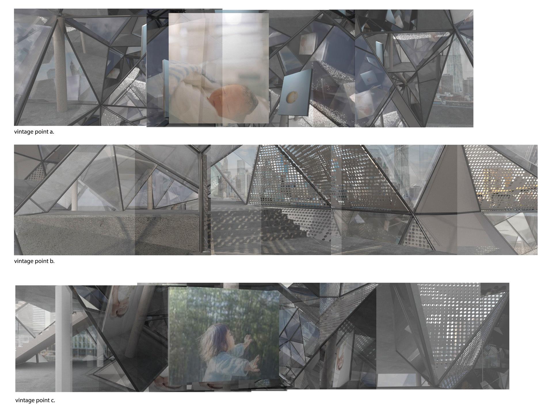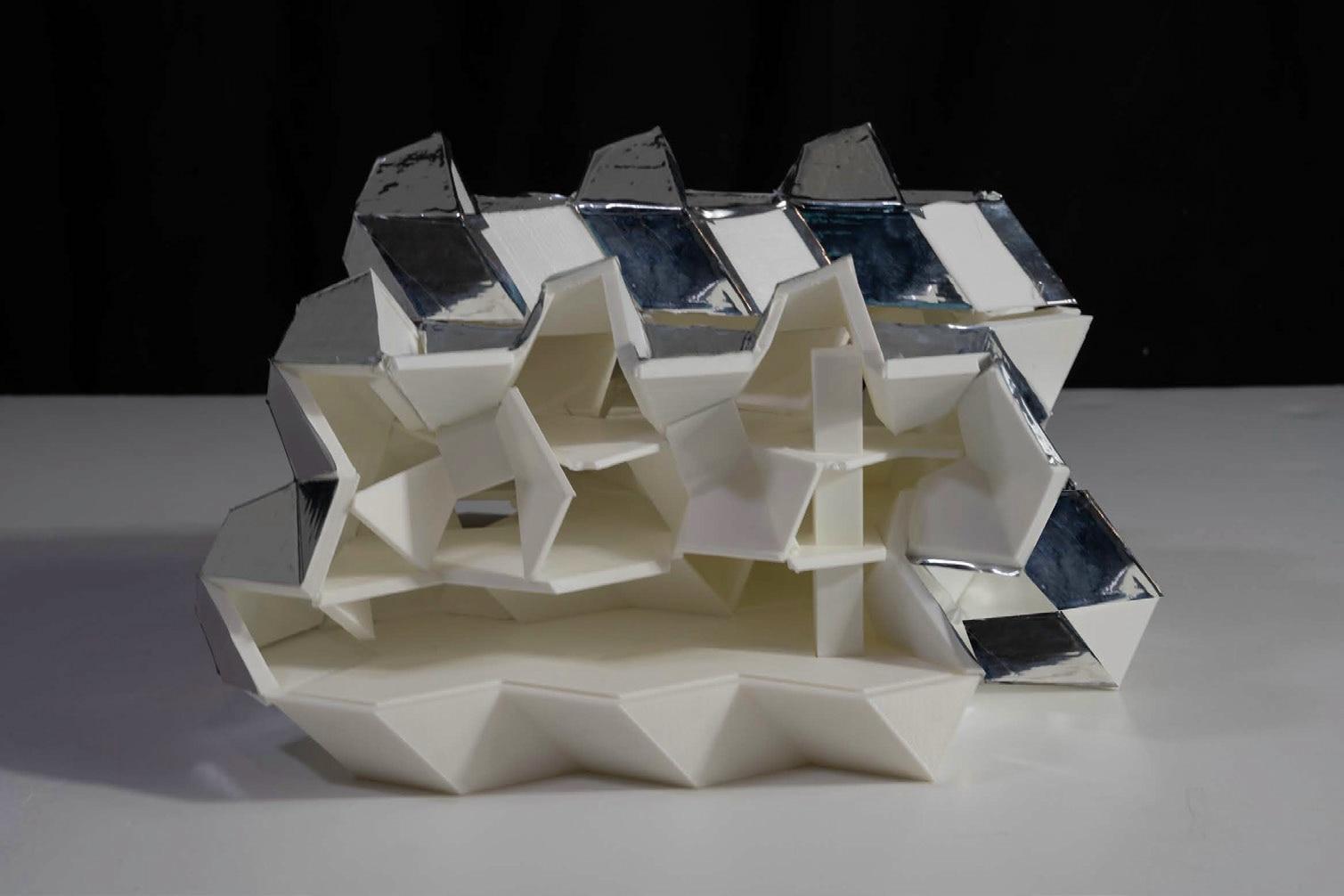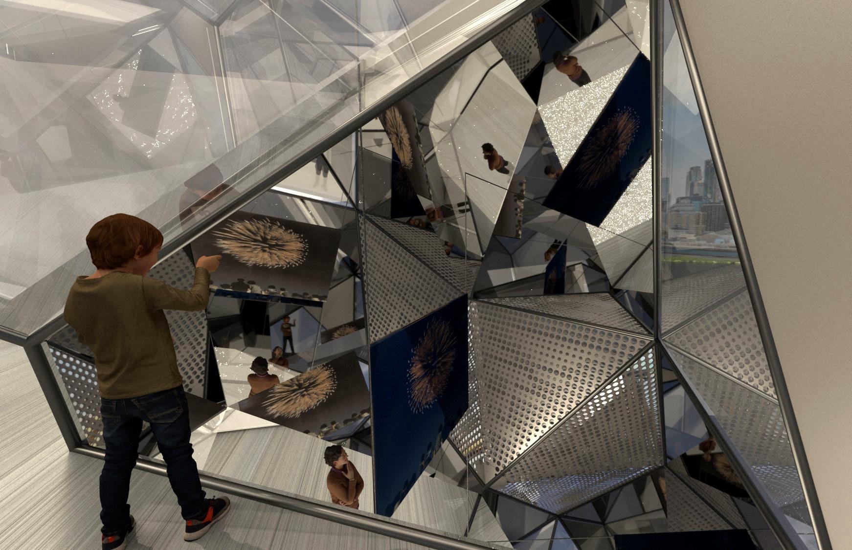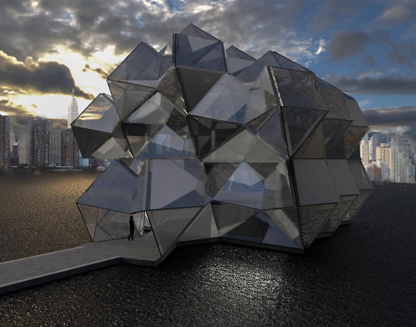 The building, situated at the center of the East River as an extension of Transmitter Park, uses light, reflection, and spatial irregularity to evoke a sense of infinity and immersion. Aggregated bisymmetric hendecahedrons shape the structure, creating irregular walls and a dynamic roofline. These geometric forms, known for their asymmetrical yet balanced qualities, generate shifting perspectives and fragmented reflections, mirroring the soft, ethereal atmosphere present in Kawauchi’s work. Mirrors and glass surfaces amplify the spatial experience, allowing visitors to engage with photography from multiple angles, as if enveloped by infinite layers of imagery. The interplay between light and reflection reimagines the boundaries between art and viewer, making the act of observation part of the artistic encounter.