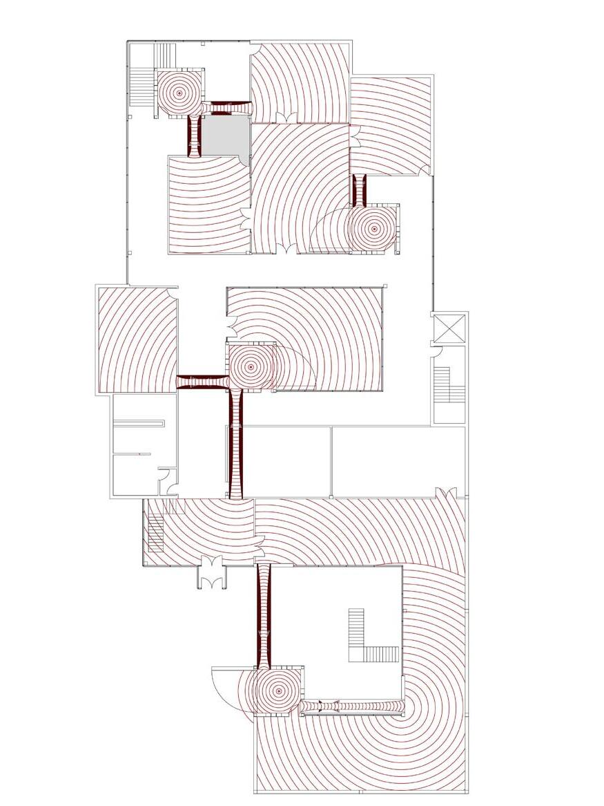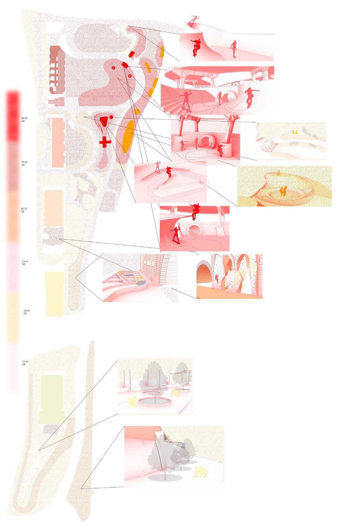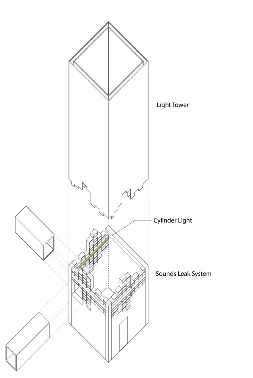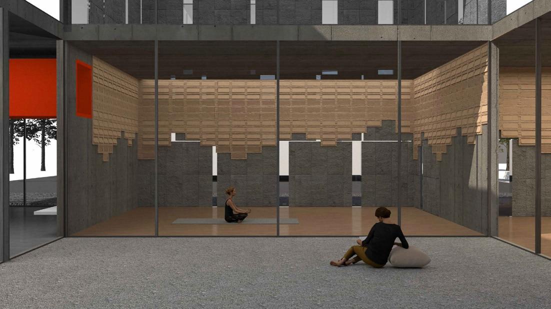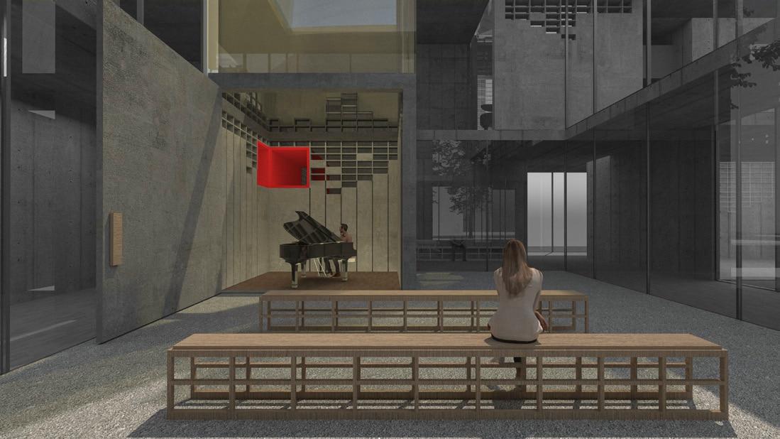 At the core of the building are multiple music booths, each housing a live musician. Through a network of carefully designed acoustic channels, the sound flows outward into adjacent spaces— yoga rooms, corridors, courtyards, and market areas—enriching every activity with a tailored auditory atmosphere. While visitors hear the music throughout the building, but the performers remain unseen, creating a sense of mystery and immersion. A system of directional pipes and sound-leak structures allows sound to travel seamlessly, sometimes producing a surreal experience where one sees a musician performing but hears the music of another, subtly layered to enhance the rhythm and energy of each space.