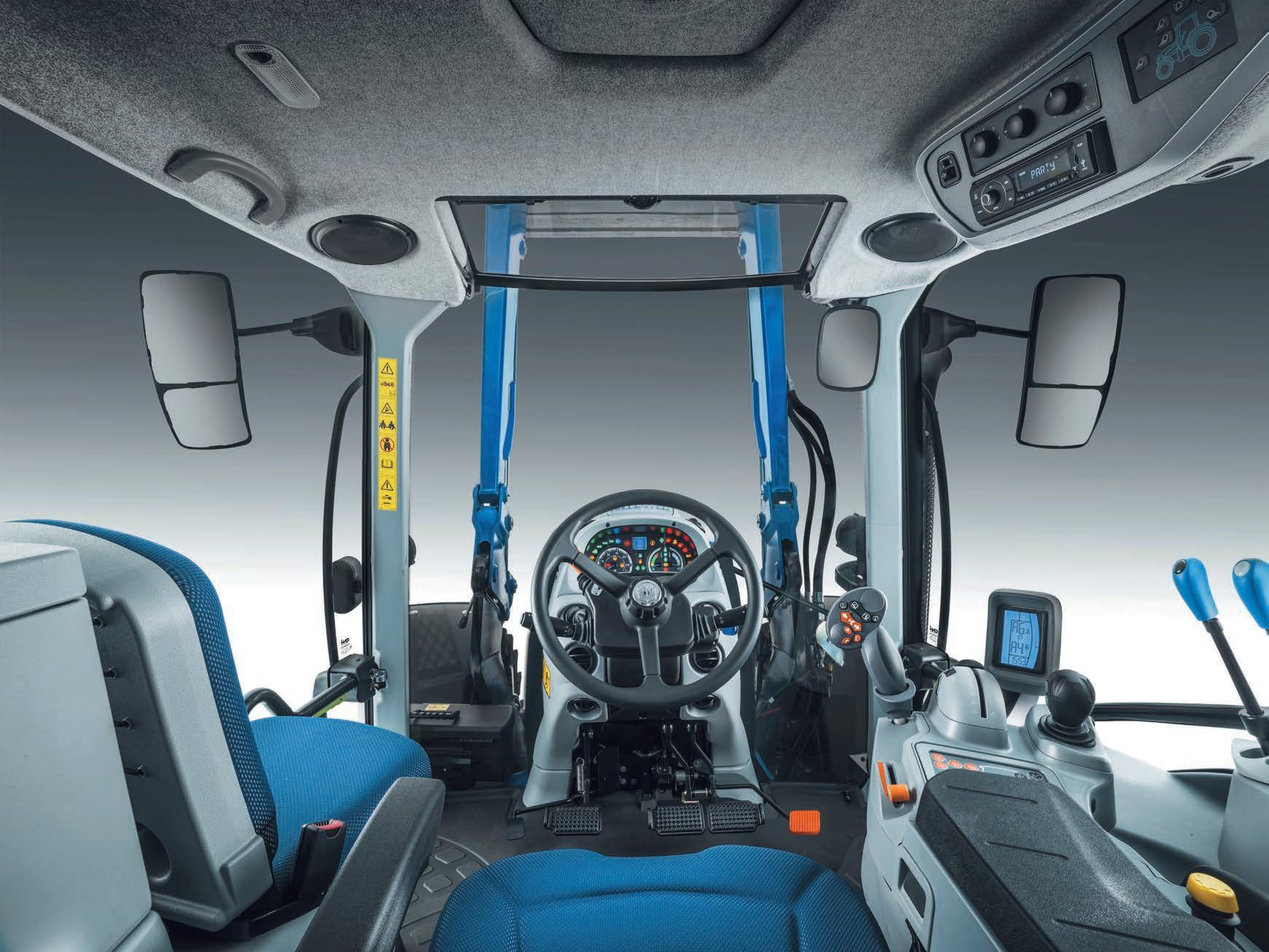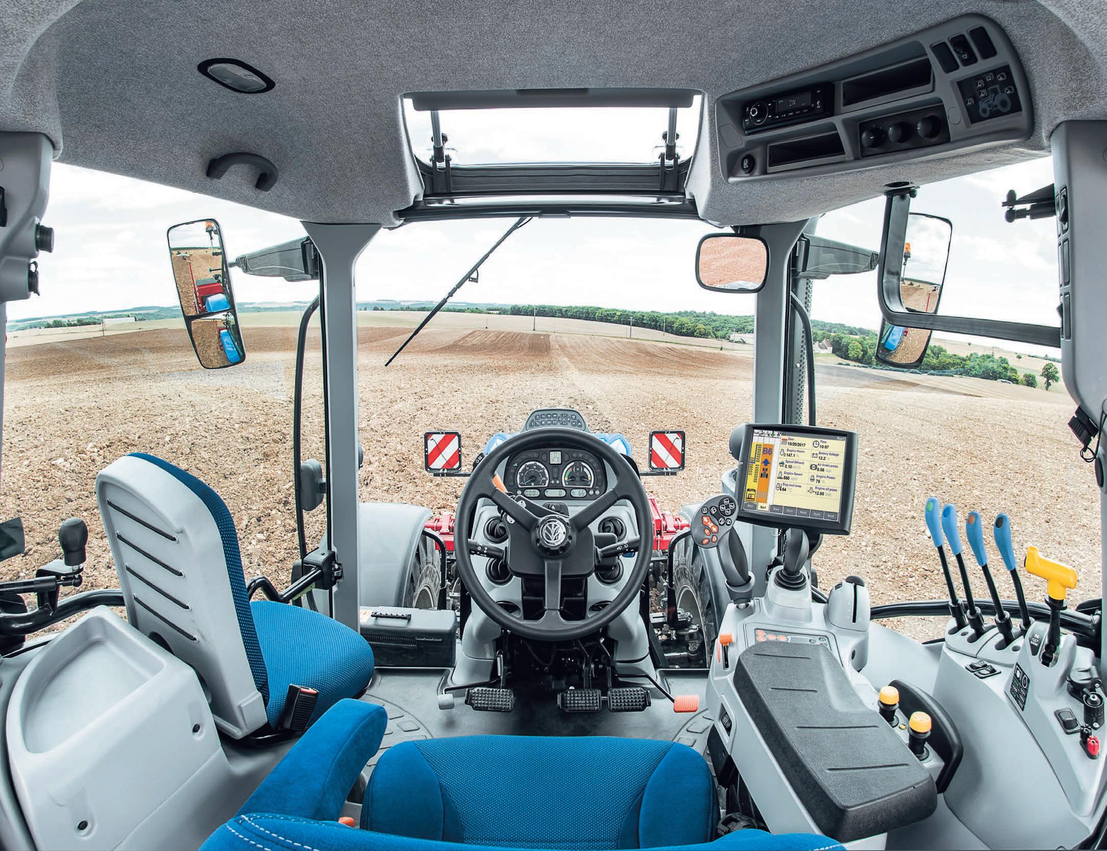 T5 Dynamic Command™ & Auto Command™ -serien drar nå nytte av new Hollands bransjeledende Horizon™ -førerhus og glasstaket med supergod sikt. Ta plass, slapp av og nyt en umiddelbar følelse av plass, komfort og lys, takket være 4-stolpekonseptet, sete med fjæring og god benplass. På gårdsplassen, ute på jordet eller på vegen har du fri sikt som klart øker produktiviteten. Alltid. Frontruten