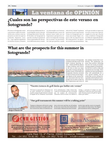 de la zona que disfrutarán de este privilegiado enclave durante la temporada estival. Para ello, El Periódico de Sotogrande ha querido consultar la opinión de varios responsables de relevancia en diferentes áreas y temáti-