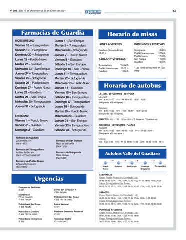 Viernes 22 – Torreguadiaro Sábado 23 – Sotogrande Farmacia de San Enrique Plaza de la Fuente 956 615128 Farmacia de Sotogrande Plaza Blanca 956 794961