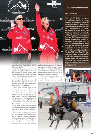 zuela (Cetursa), or Gastón Streiger, (BMW Spain), among others. Aside from the sport there was plenty of partying. The organisers of the event made sure there was a schedule crammed with entertainment and no shortage of delicious culinary delicacies, plenty of champagne, the most distinguished luxury and, above all, a good atmosphere. The fun was guaranteed throughout this exceptional weekend which marked a turning point in making the Andalusian ski resort a top polo venue. As far as the polo itself was concerned, the spectacle was present over the two days of play. In the end the Jaeger-LeCoultre team was victorious, beating Casablanca by 9 goals to 4.5 in the final. The team of Jack Kidd, Hernán Pieres and Richard Fagan had more penetration over the last few metres than Casablanca, made up of Alejo Taranco, Gonzalo Muñoz Escassi and Carlos Piñal. Fortunately the sun put in an appearance on the field of play and remained until just after the final, when there was some light snowfall to provide the perfect end to a first-class competition. Previously the subsidiary final had been held, in which Santa María defeated Península by 7 goals to 6 in what was probably the most exciting match of the tournament. Mario Gómez for Santa María and George Meyrick for Península were the best players; the Englishman scored the best goals of the