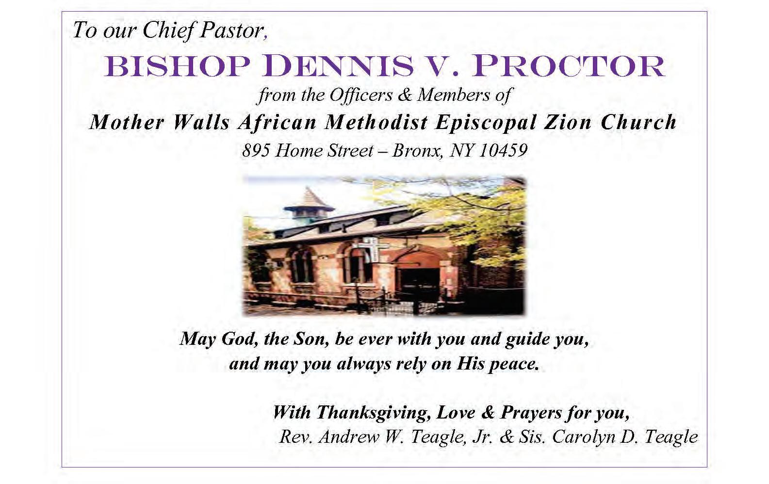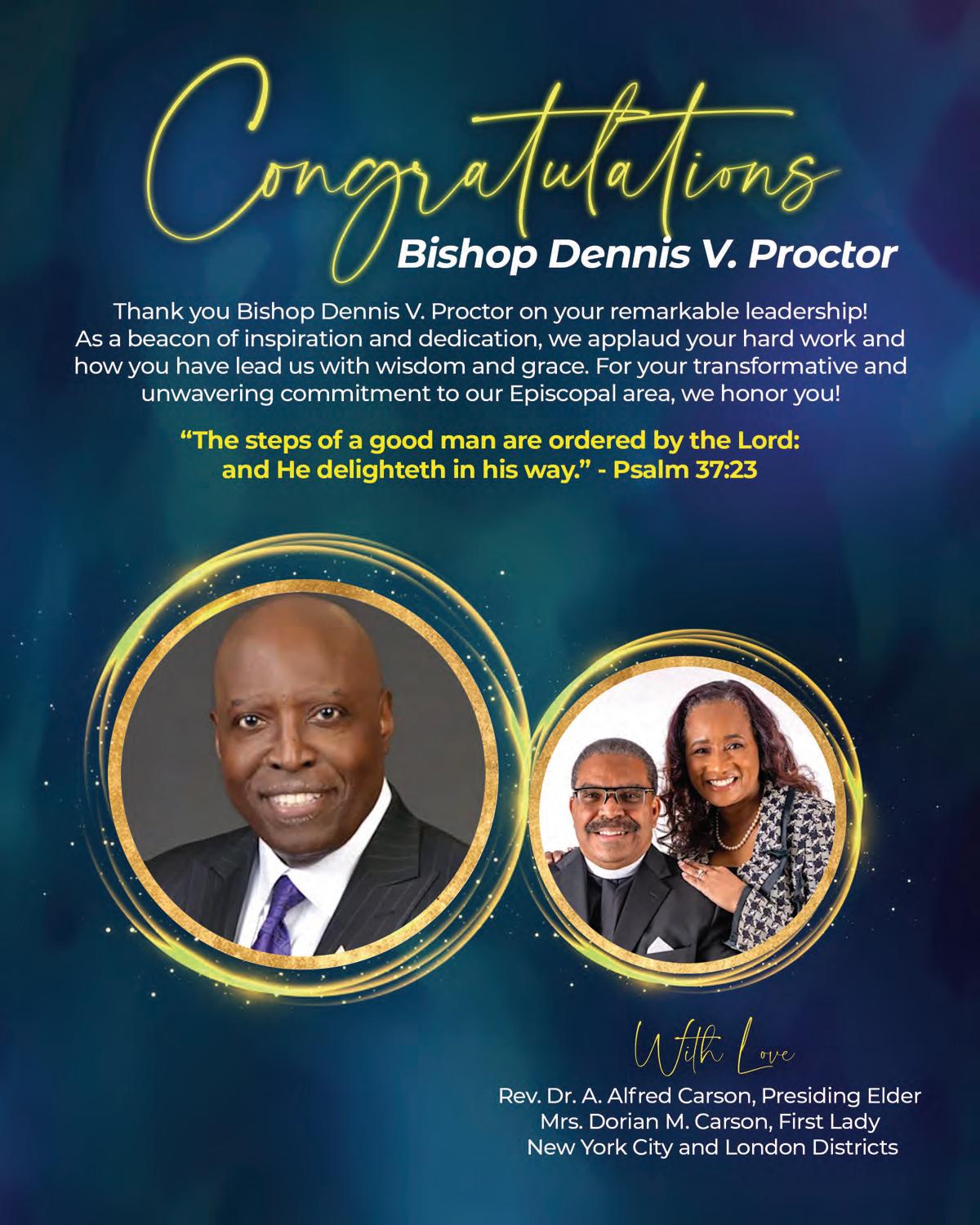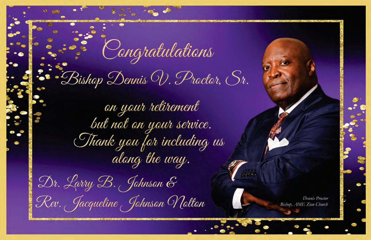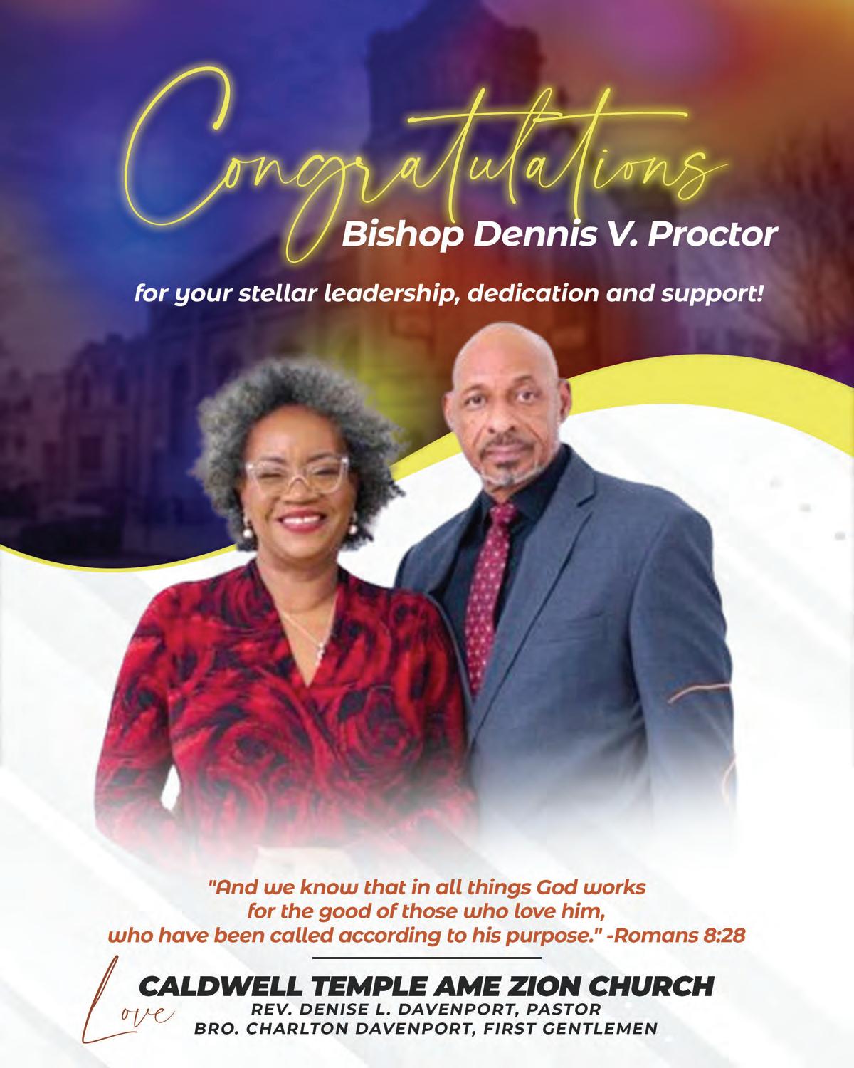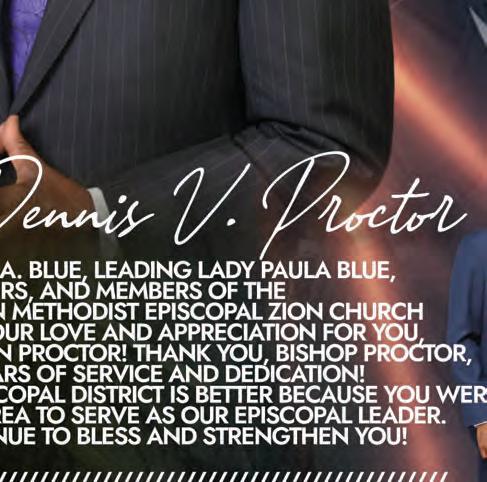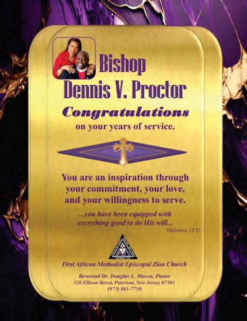 Congratulations to you, Bishop Proctor, aswe celebrate your faithfulness to GOD and amazing leadership ofTheAfrican Methodist Episcopal Zion Church.