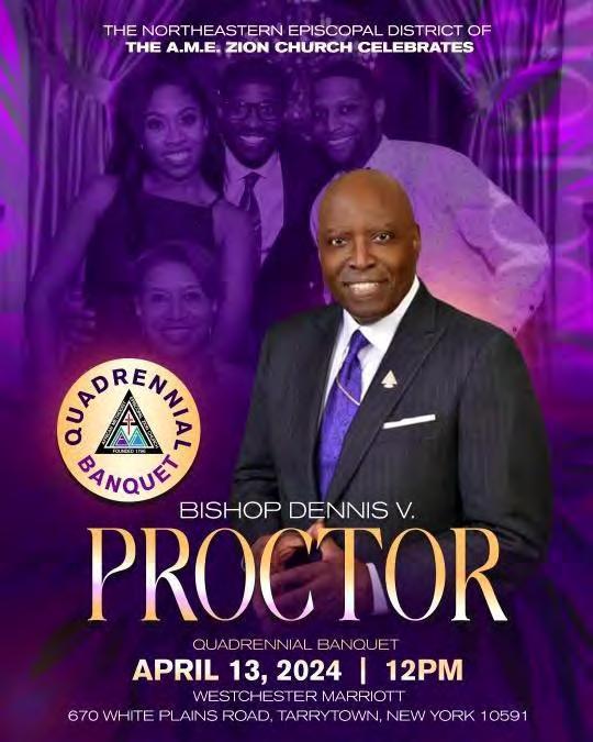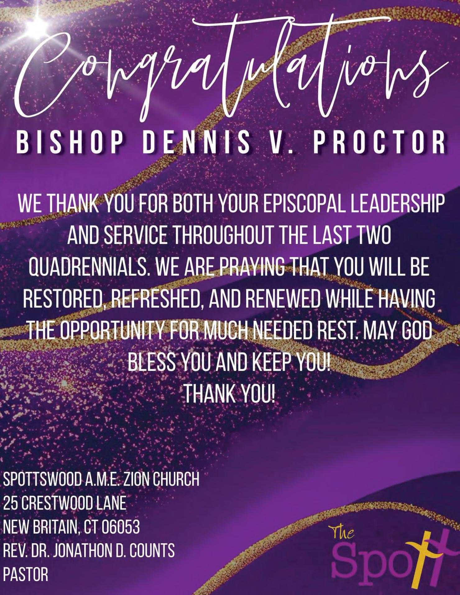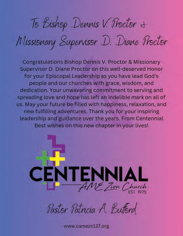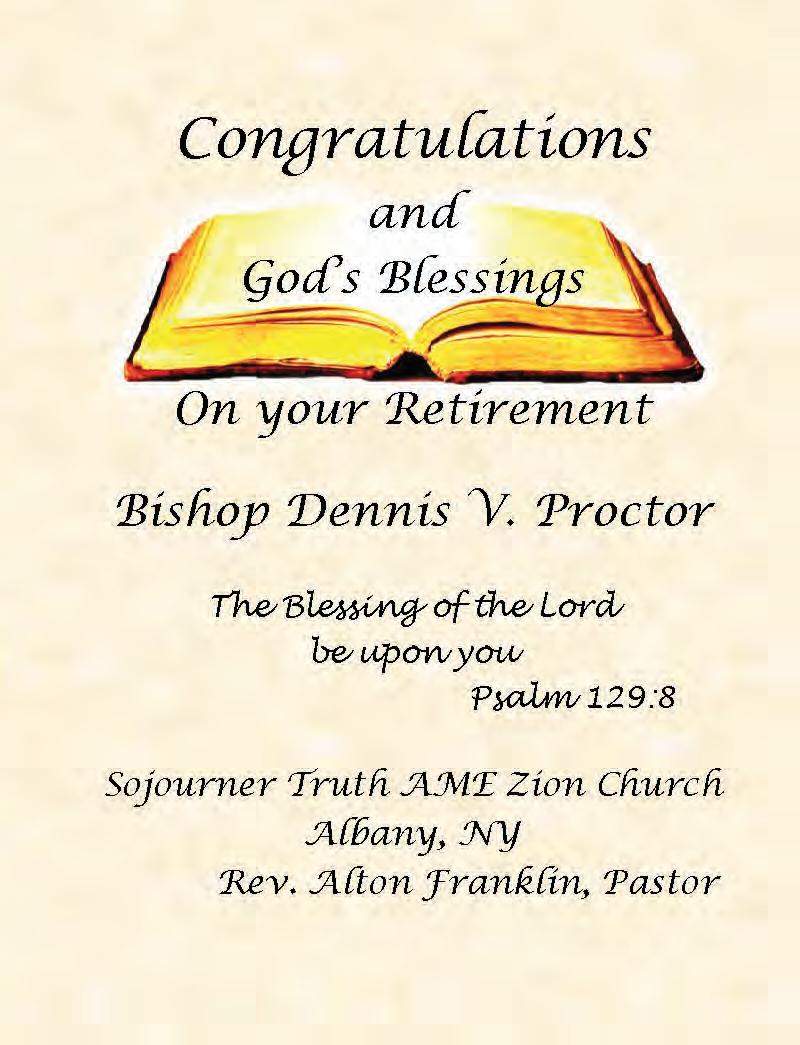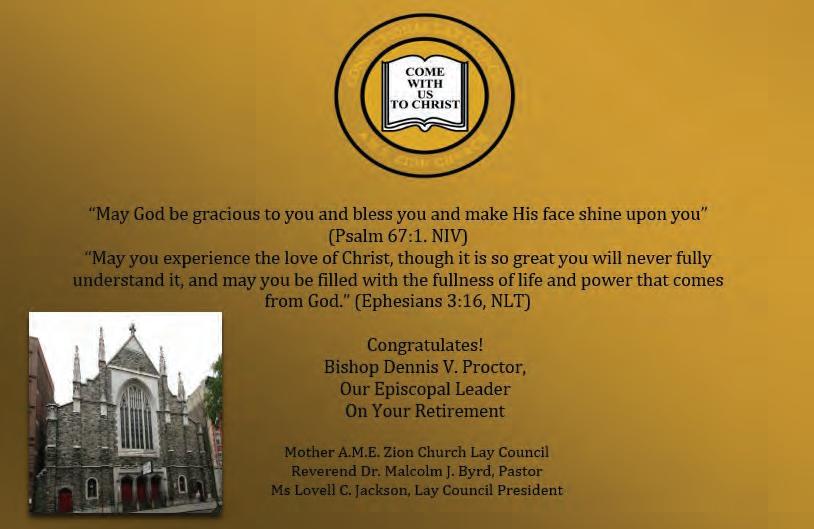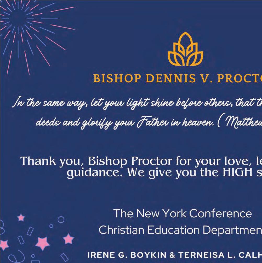 Congratulations to you, Bishop Proctor, aswe celebrate your faithfulness to GOD and amazing leadership ofTheAfrican Methodist Episcopal Zion Church.