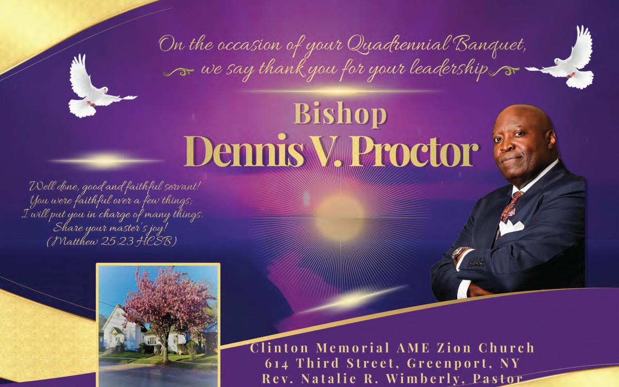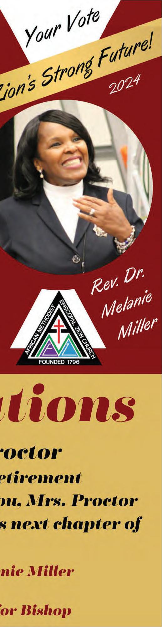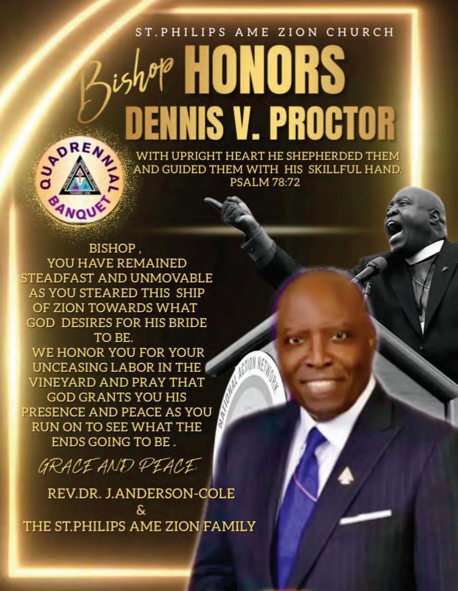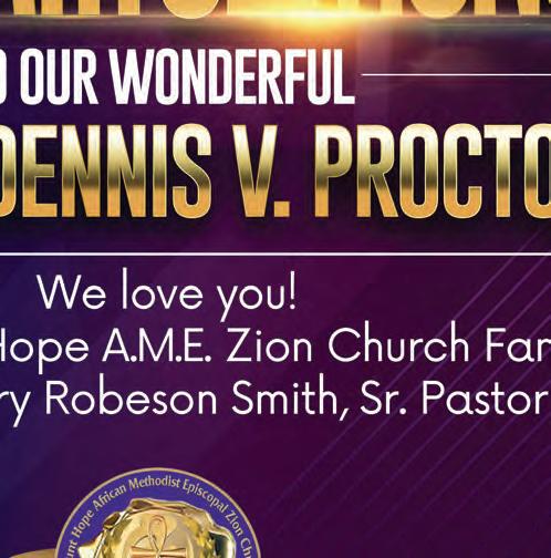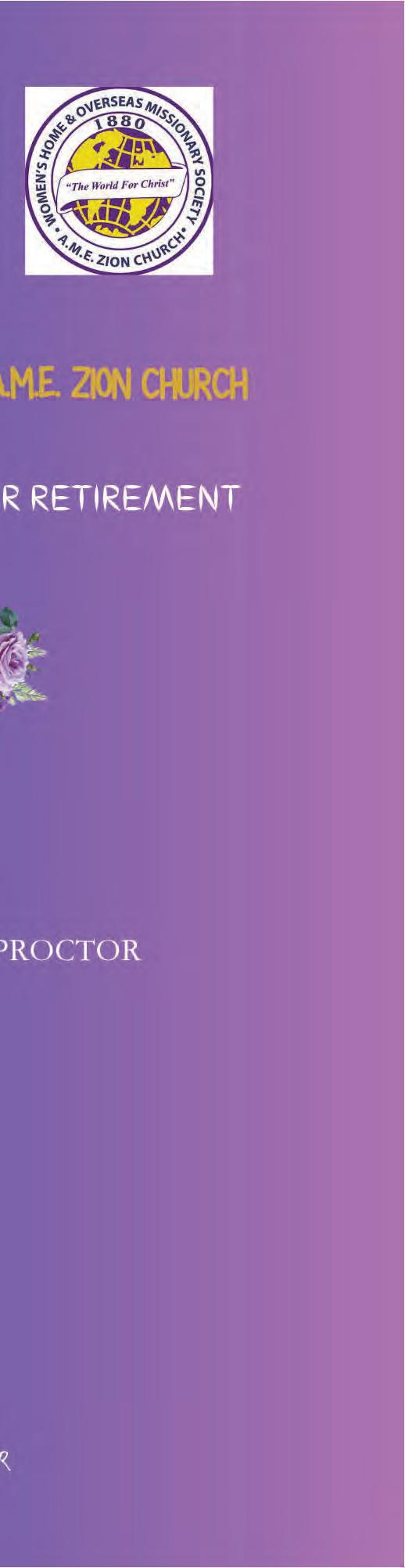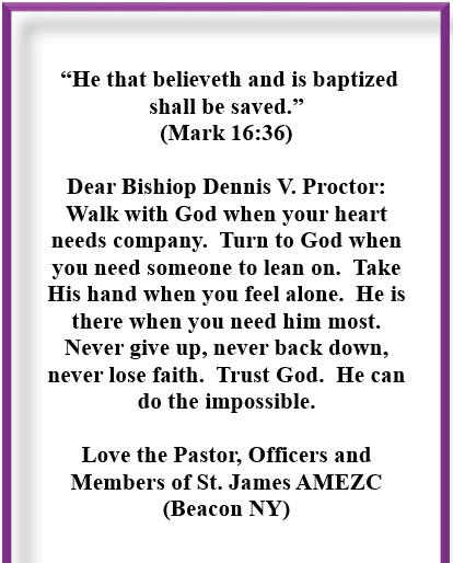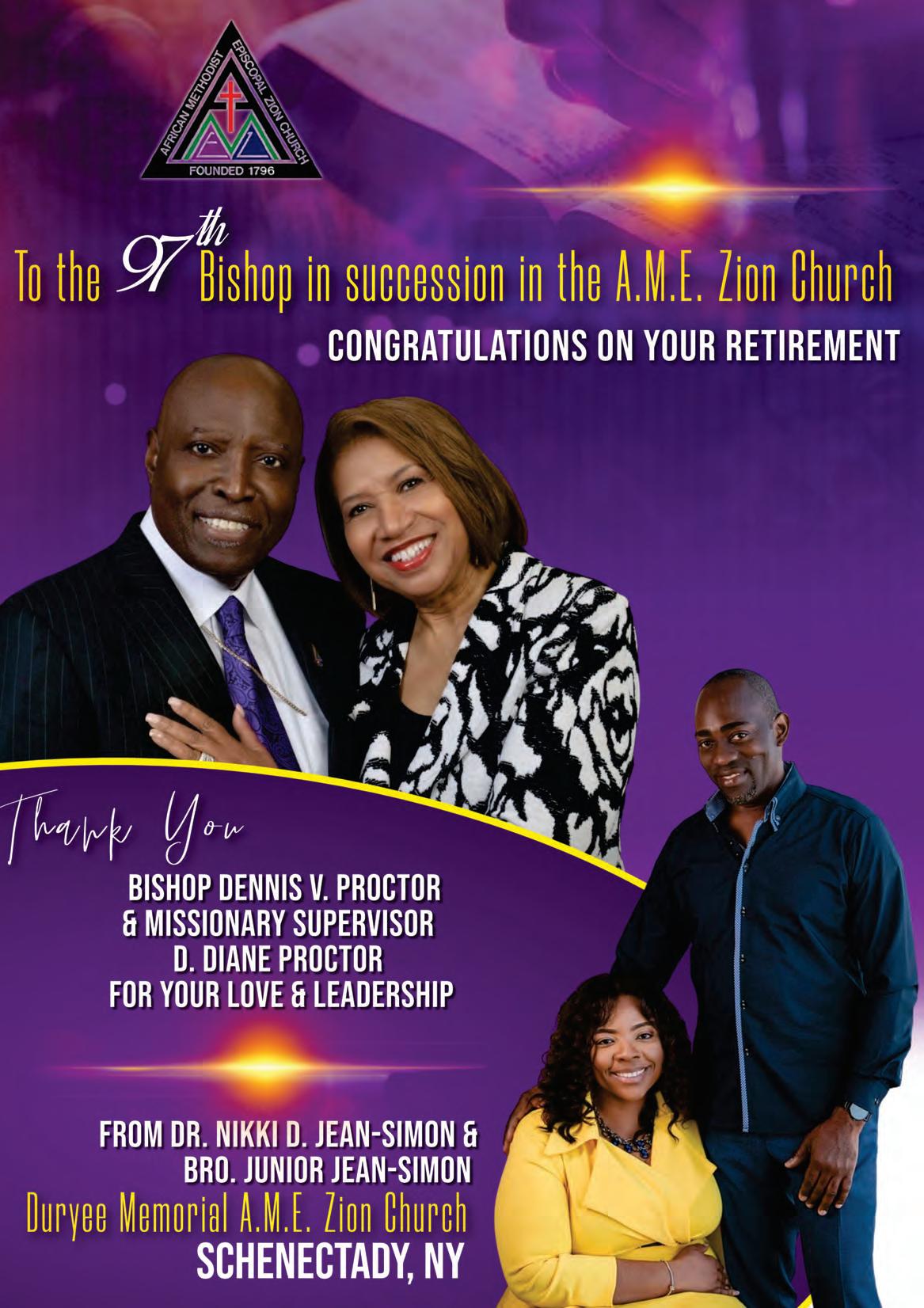 Congratulations to you, Bishop Proctor, aswe celebrate your faithfulness to GOD and amazing leadership ofTheAfrican Methodist Episcopal Zion Church.