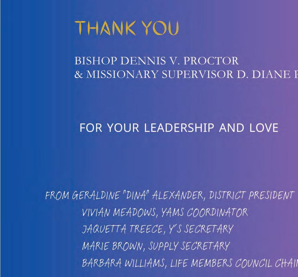 GOD bless you, keep you, and preserve you, Bishop Proctor, Missionary Supervisor, Mrs. D. Diane Proctor, and your family for the best is yet to come! Amen.