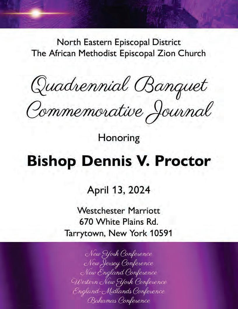 Wordsareinadequateandcouldneverexpressthedepthoflovewe haveinourheartsforourEpiscopalFather,BishopDennisV.Proctor. Thankyouforyourstellarleadership,guidance,wisdom,andfaithful yearsofservicetotheNorthEasternEpiscopalDistrict. 1Timothy 5:17remindsus,"Elderswhodotheirworkwellandleadeffectively shouldberespected,paidwellandconsideredworthyofdouble honor,especiallythosewholaborinpreachingandteaching." Bishop Proctor,youareindeedworthyofdoublehonor.Pleasereceivethese expressionsofloveandgratitudefromallofusintheNorthEastern EpiscopalDistrict. Thesegreetingshavebeencollectedandboundin thiscommemorativejournalforyou.
