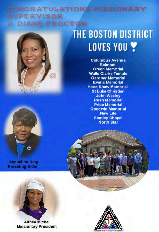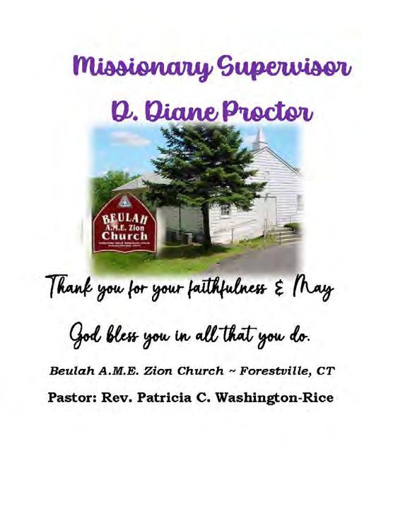 YOUTH BUDS SUPERINTENDENT SUPPLY SECRETARY CHAIRMAN, LMC VERDELLE CUNNINGHAM JOAN CAPEL KIMBERLY DOUGLAS WILHELMINA LEE MATTIE W. TAYLOR KATHRYN F. WARREN DIRECTOR, MISSION ED. NATIONAL COUNCIL BALM IN GILEAD CHURCH WOMEN UNITED WFM&UCW REPORTER & & TREASUER NEGRO WOMEN, AFF. REP. AFFILIATE REP. AFFILIATE REP. AFFILIATE REP. SPIRITUAL LIFE CHAIR Congratulations & Blessings MRS. D. DIANE PROCTOR MISSIONARY SUPERVISOR NORTH EASTERN EPISCOPAL DISTRICT ForyouroutstandingMissionLeadershipthroughoutthe 2019-2023Quadrennium.