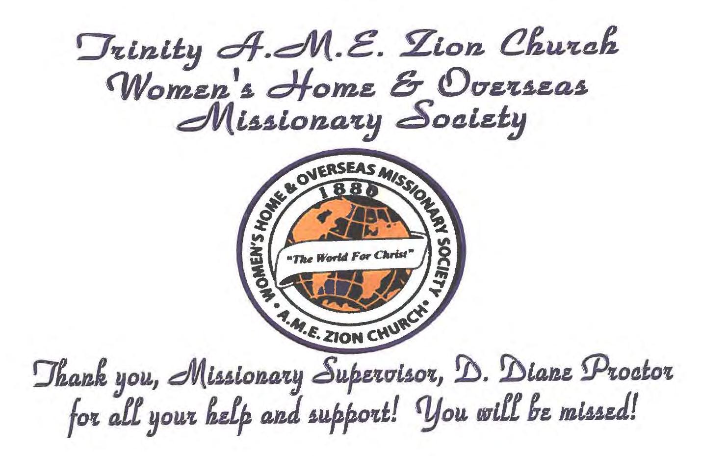 CONGRATULATIONS AND THANK YOU TO OUR BELOVED MISSIONARY SUPERVISOR, D. DIANE PROCTOR, FOR BEING AN INSPIRATION AND AN EXAMPLE OF A GOD-FEARING WOMAN.