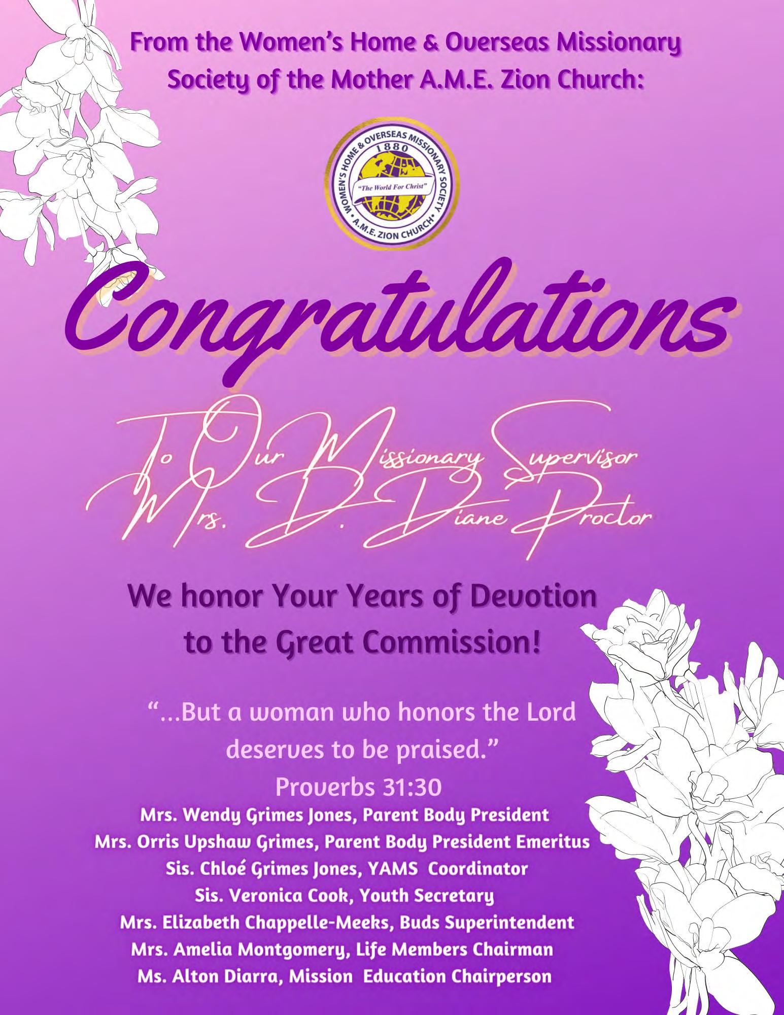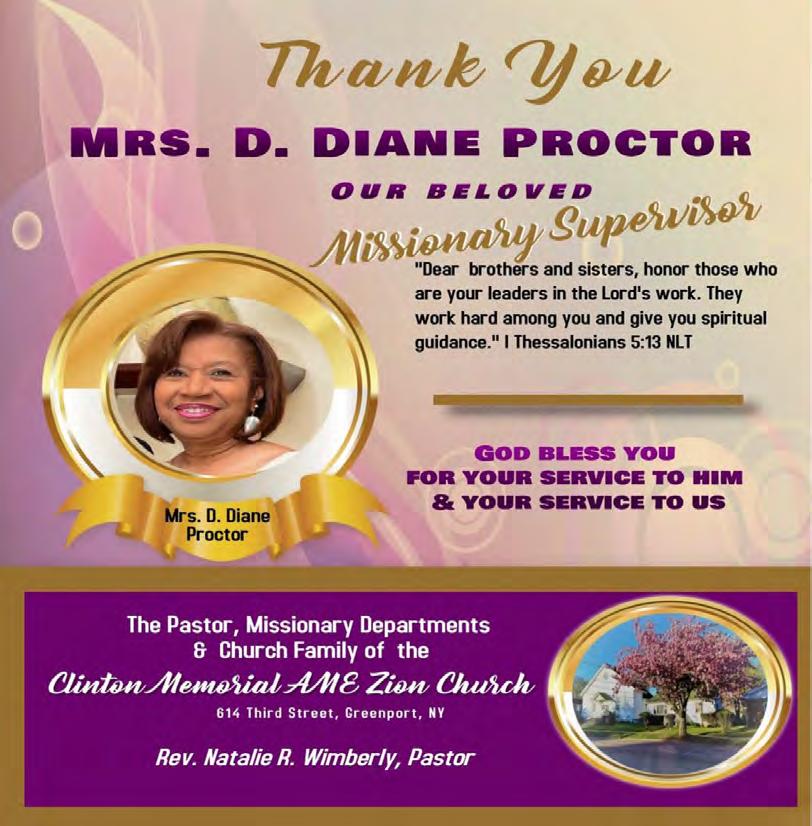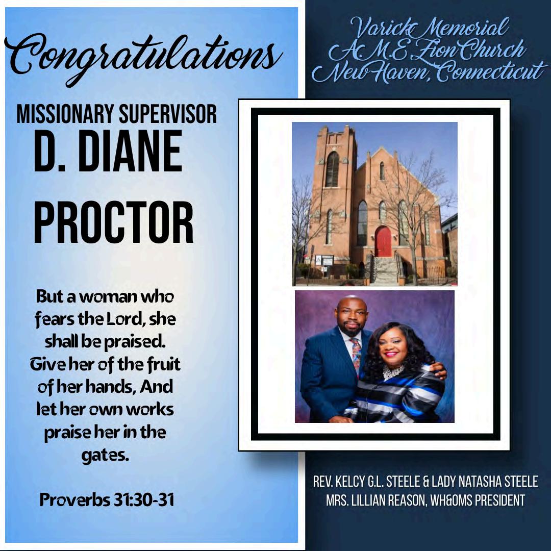 Congratulations Mrs. D. Diane Proctor on your faithful years of service as our Queenly, beautiful, intelligent, loving, compassionate and dedicated Missionary Supervisor.
